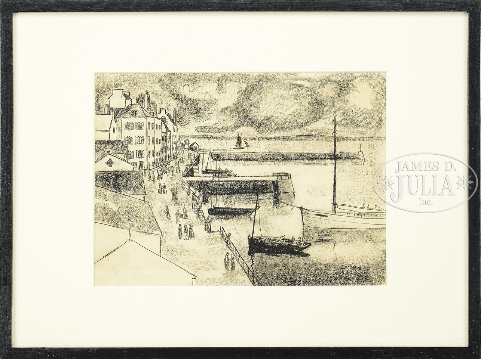 CHARLES H. RATHBONE JR (American, 1902-1936).Lot of 2 French scenes Charcoal on paper Both signed lower right one inscribed “Dourarnenez” Framed in simple wood frames SIZE: 9″ x 12-1/4″ Overall: 15″ x 20″ 8-1/2″ x 11-1/2″ Overall 15″ x 20″ PROVENANCE: Descended through the family of the artist CONDITION: Very good Not examined out of frame 9-93453 (500-700) – Lot 1430