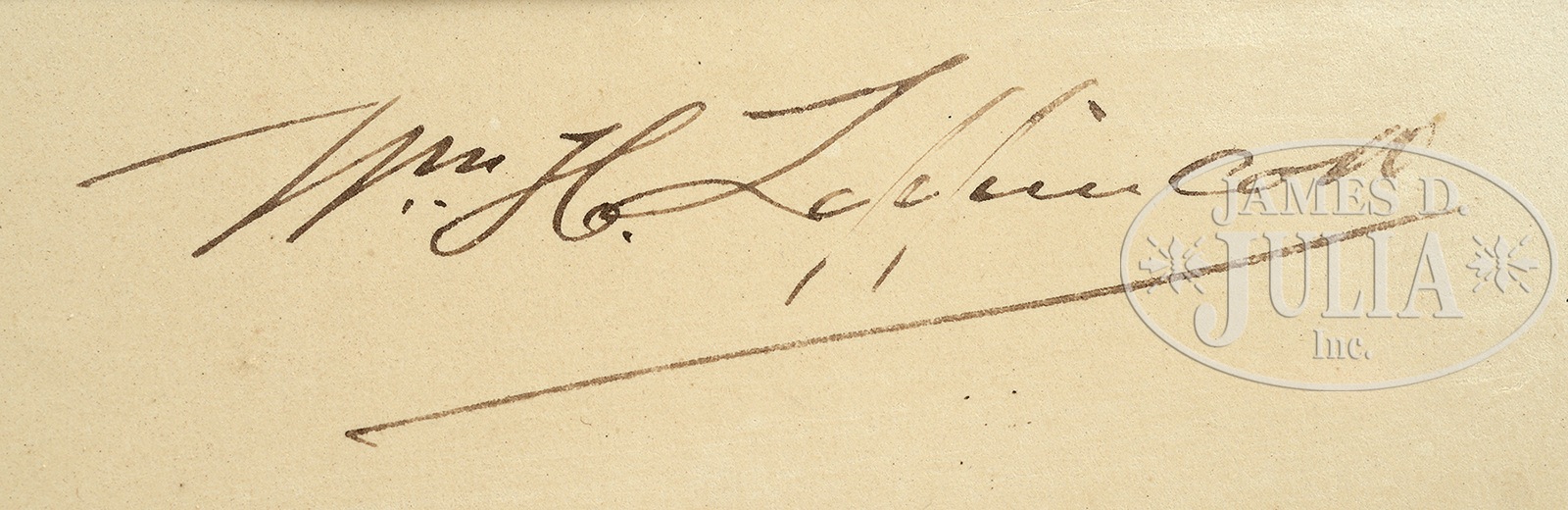 WILLIAM HENRY LIPPINCOTT (American, 1849-1920) PORTRAIT OF A LADY WITH PLUMED HAT.Watercolor and gouache on paper Housed in a modern gilt wood frame Monogrammed and dated lower right “1882”, Signed on mat lower right “Wm H. Lippincott”, and inscribed and dated lower left “XMas. 1882″ SIZE: Sheet 12″ x 9”. Overall: 25″ x 19″ CONDITION: Watercolor is mounted at corners to backing, water stain to bottom edge, otherwise good 49111-10 (1,000-1,500) – Lot 1430