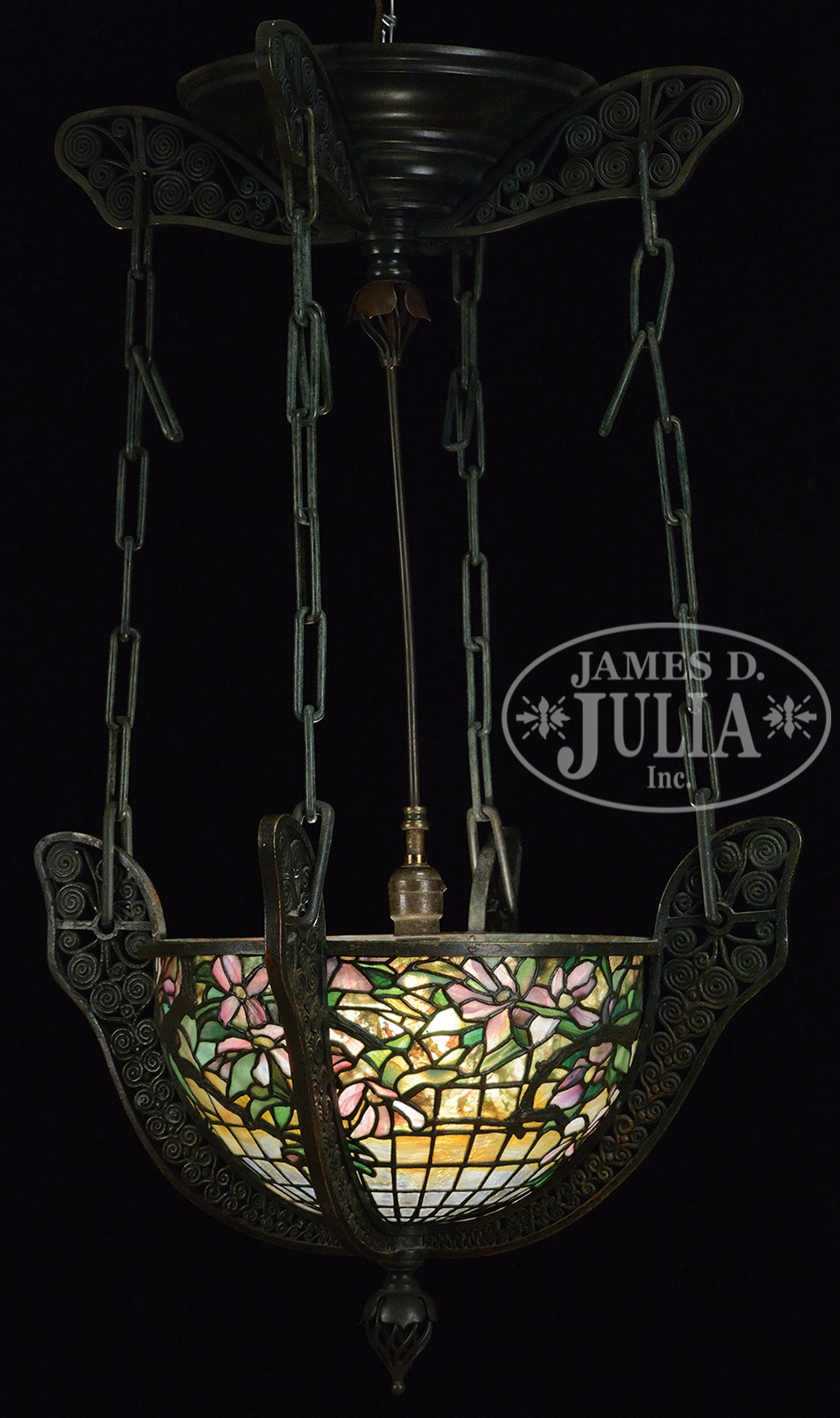 MOORISH LEADED GLASS CHANDELIER.Chandelier has cast bronze ceiling cap with 4 bronze arms with Moorish pattern of spiraled wires creating a reticulated pattern within each of the arms. Lower section of chandelier has matching Moorish decorated arms which house an inverted dome leaded glass shade. Shade has a band of pink, white and yellow striated flowers against a translucent green as well as green confetti glass leaf background giving way to an amber shading to clear geometric ground at bottom. Shade is overlaid with cast bronze tree limbs in each of the 4 panels. Bottom of ceiling cap as well as bottom of chandelier are finished with an openwork finial. Cap and lower chandelier are connected by 4 heavy link bronze chains. Chandelier is illuminated by single socket which extends from cylindrical rod from ceiling cap. Bronze has a dark brown patina with green highlights. Unsigned. SIZE: 36″ from ceiling to tip of finial. CONDITION: Metal is very good to excellent with some wear and discoloration to patina. Shade is very good to excellent with very few if any tight hairlines. 49587-1 (10,000-15,000) – Lot 1430