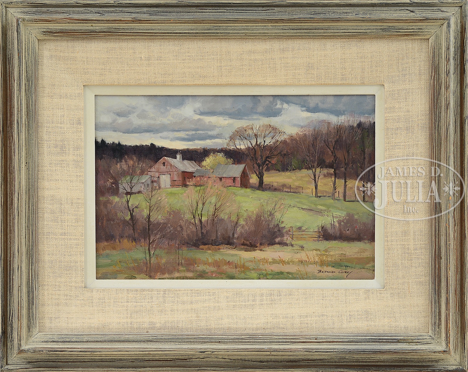 BERNARD COREY (American, 1914-200) “FARM AT HARDWICK”.Oil on canvas board Housed in a gray frame with linen liner Signed lower right “Bernard Corey”, inscribed on verso frame “Bernard Corey / Farm at Hardwick”, bears Rockport Art Association showroom exhibition label on verso SIZE: 8″ x 12″. Overall: 15-1/2″ x 19-1/2″ CONDITION: Very good to excellent 50652-8 (800-1,200) – Lot 1430