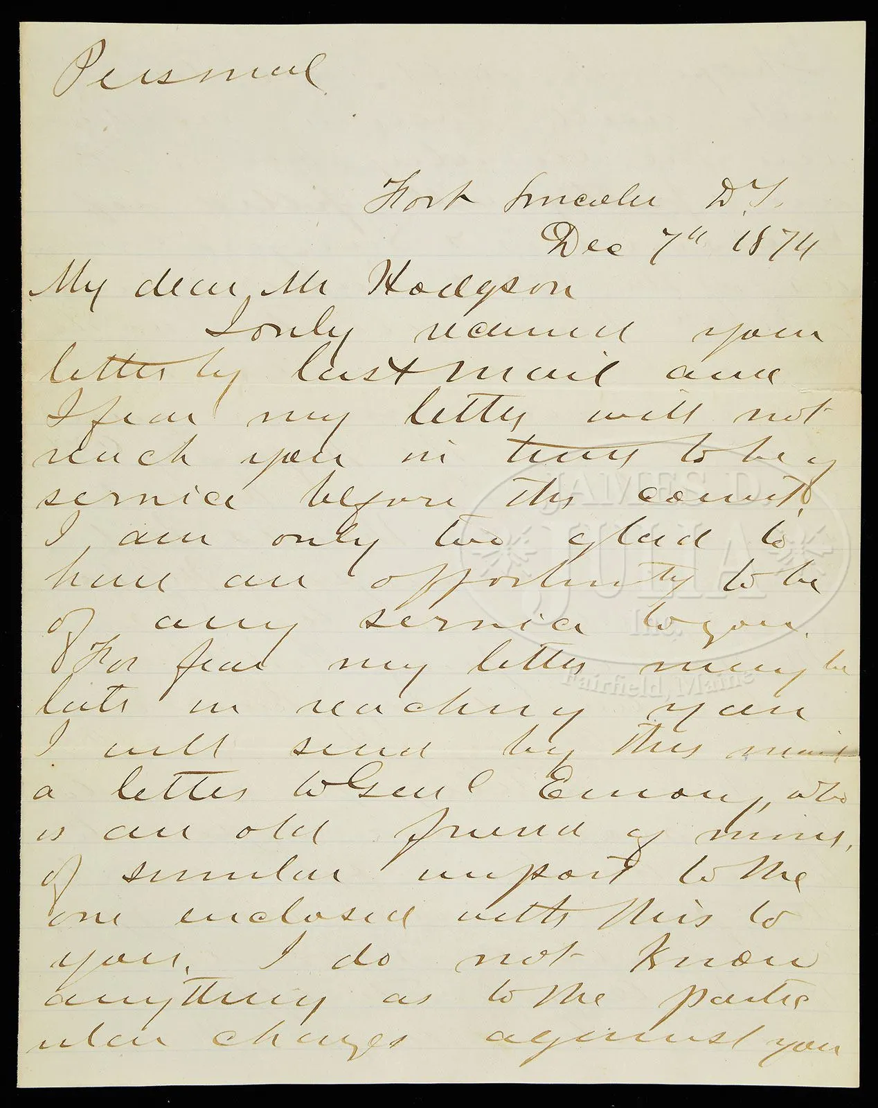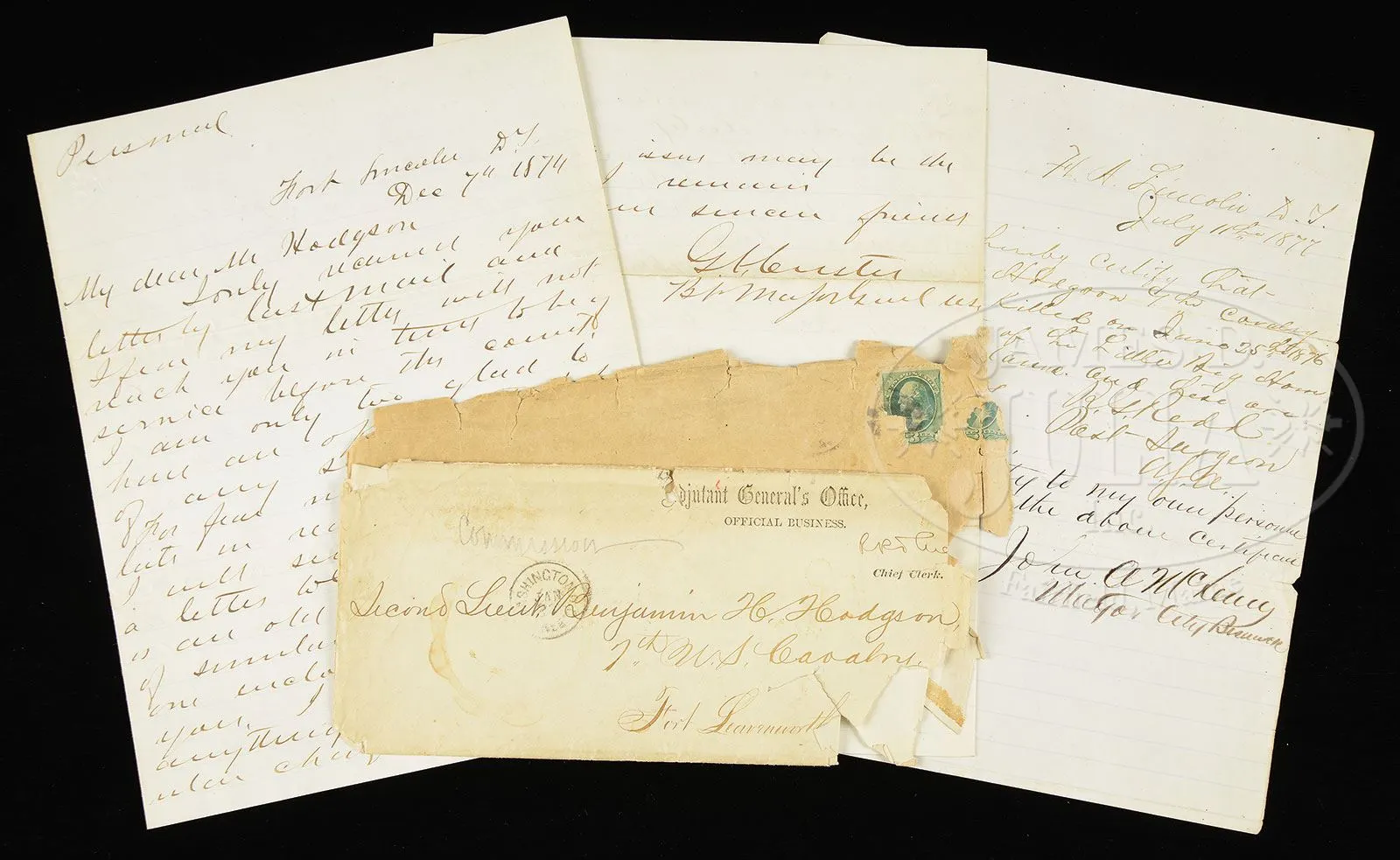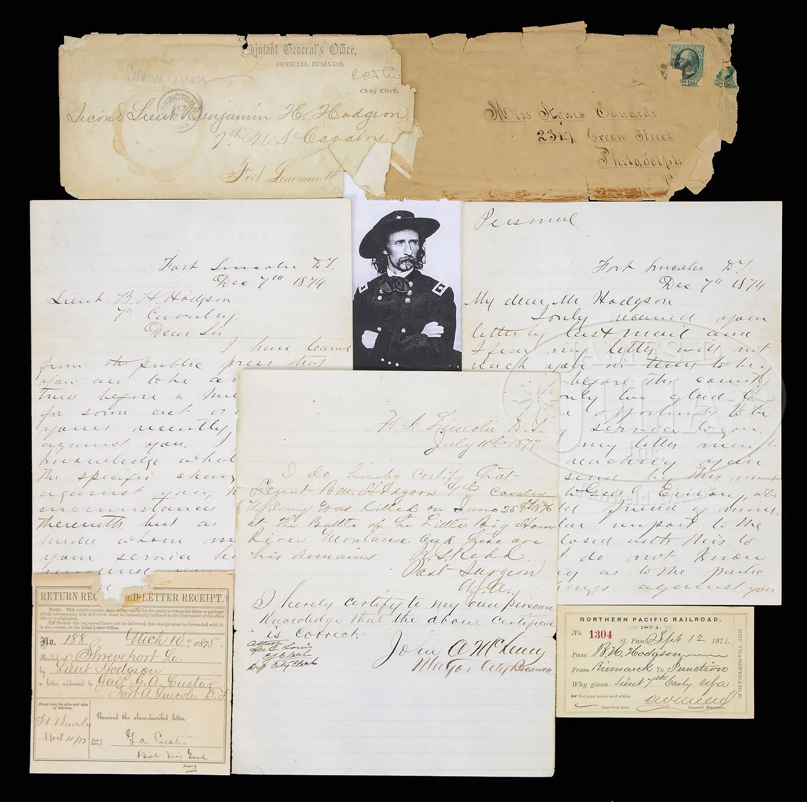 RARE ARCHIVE OF LT. BENJAMIN HODGSON INCLUDING TWO GEORGE CUSTER LETTERS WRITTEN TO HIM ALONG WITH OFFICIAL CERTIFICATION OF HIS REMAINS FROM LITTLE BIGHORN BATTLEFIELD.2nd Lt. Benjamin Hubert Hodgson was a West Point graduate in 1870 and was a personal favorite of George Custer as noted in these letters. The first letter, 3-pages long is marked “personal” dated Ft. Lincoln December 7 1874. Hodgson was facing court-martial for threatening a local with a pistol and conduct unbecoming an officer and a gentleman. Hodgson had sought Custers aid as a character witness and Custer’s letter is of a personal nature telling Hodgson of the environs of Ft. Lincoln and that “Mrs. Custer joins me in high regards”. The second letter with the same date is quite official and was obviously to be used as evidence and read at the trial of Hodgson’s character. Custer writes “…as the officer under whom most of your service has been rendered, you have served upon my staff as well as having commanded a company under me for a considerable period. I desire to testify to you and for you if possible my high appreciation of your character, both as an officiant and meritorious officer, and a thorough and courteous gentleman. I have ever found you ready and prompt to undertake any duty assigned you and once assigned you have always, without fail, rendered complete satisfaction in its thorough discharge… I feel confident from my long and intimate acquaintance with your character that if you have done or have failed to do (anything) inconsistent with your duty or opposed to the service it has been the result of neither desire or intention on your part but likely a simple error of judgment…I should deeply regret to learn that the result of your trial was unfavorable to you or your interests and I am sure that in all that I have written herein every officer of your regiment who has served with you would add their unqualified concurrence…” Custer took care of “his own”. Hodgson was acquitted and returned to Custers command at Ft. Lincoln and on June 25 1876 became one of the first officers to fall. Capt. Thomas MacDougal along with two of his enlisted men recovered Lt. Hodgson’s body and carried it to the breastworks on Reno Hill. They sewed him up in a blanket and poncho and buried him. Hodgson may have been the only officer to have been buried during the battle. There is a Bismark Dakota Territory clerk sealed paper which states “I do hereby certify that Lt. Ben. Hodgson 7th Cavalry US Army was killed June 25 1876 at the battle of The Little Bighorn River Montana and here are his remains. Signed by the post surgeon at Ft. Lincoln July 11 1877. This document is certified and signed by the mayor of Bismark. Also included in this lot are three envelopes, one being the wrapper for the Hodgson letter received by Custer and a rail pass for Hodgson on the Northern Pacific Railroad 1874. PROVENANCE: Bonham’s 2004 Lots 76, 77 & 78. CONDITION: The 3 noted letters are very good with light soiling, more on the Surgeons Certification. Envelopes and return letter receipt are discernible with tears; missing portions as can be seen in photographs. Railroad pass is very good. 4-54965 JS133 (20,000-30,000) – Lot 1431 Click here to view provenance
