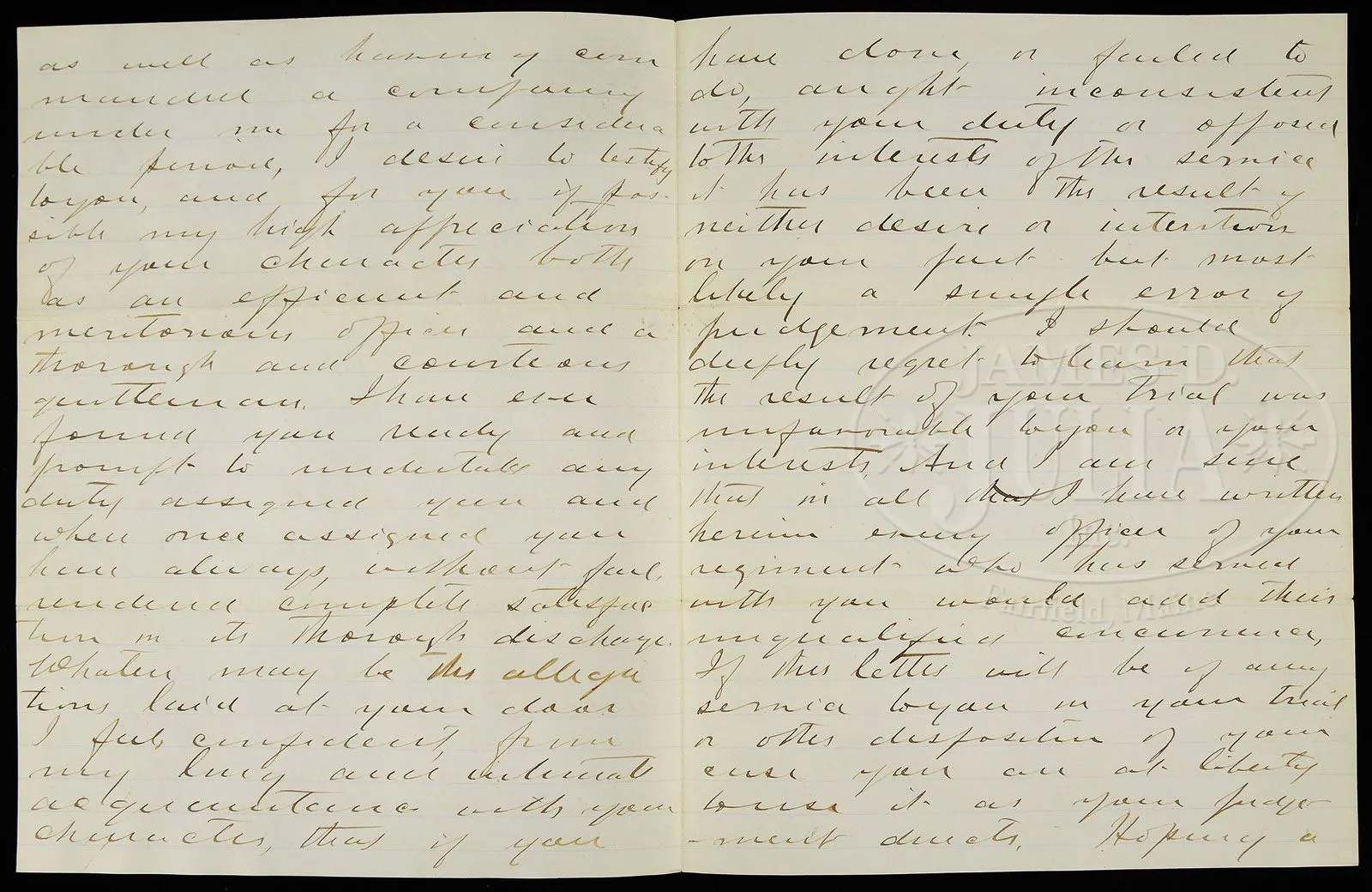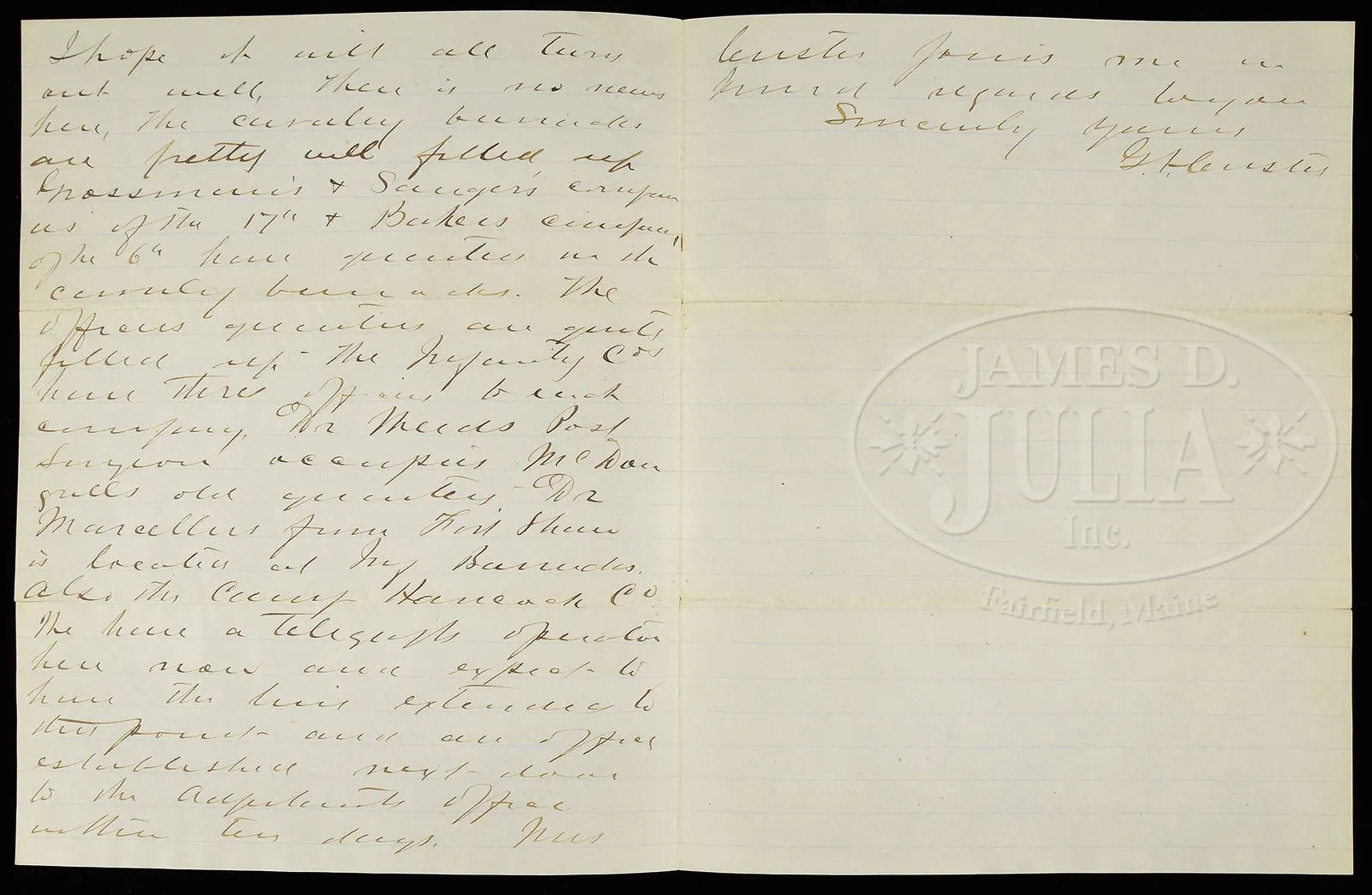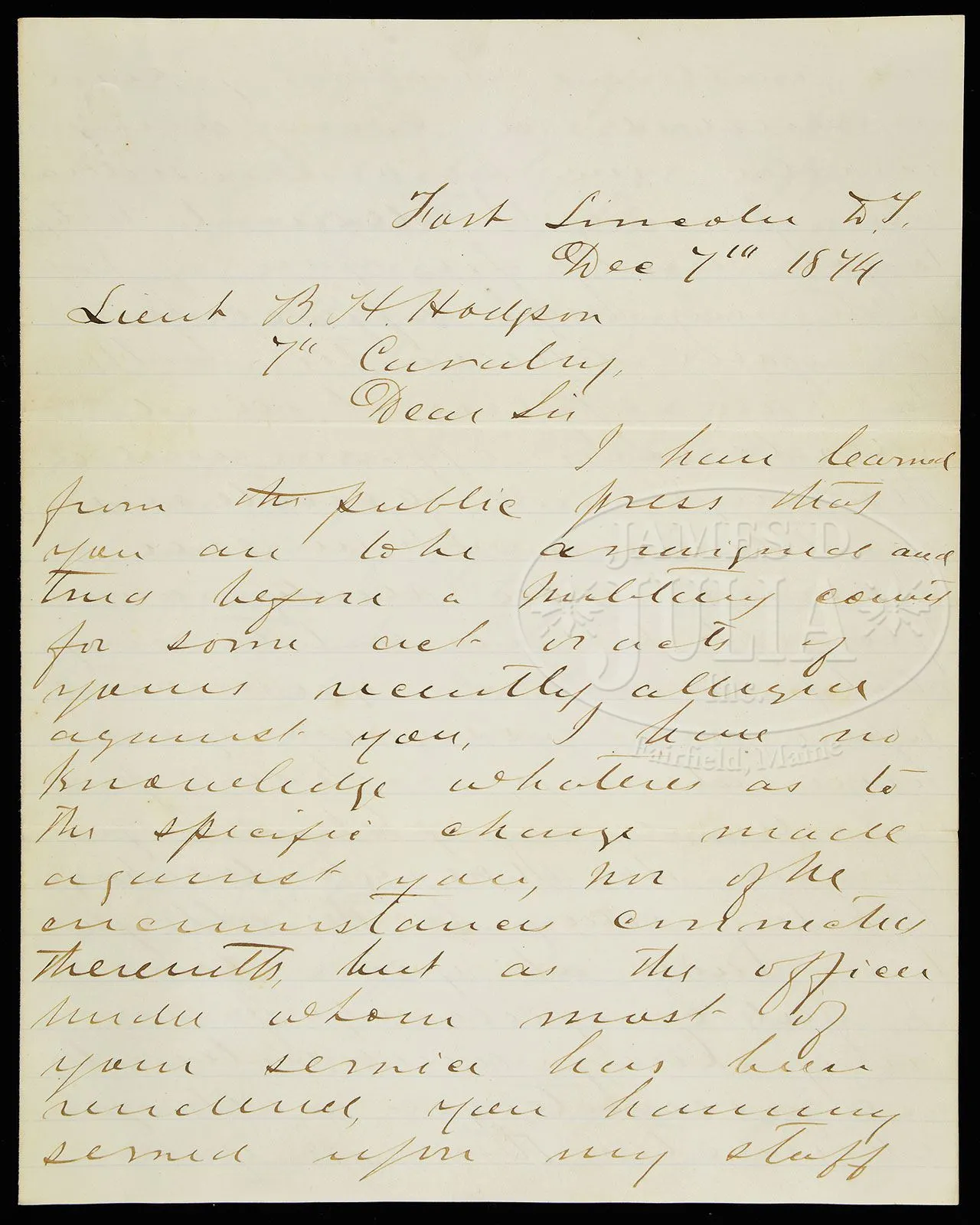 RARE ARCHIVE OF LT. BENJAMIN HODGSON INCLUDING TWO GEORGE CUSTER LETTERS WRITTEN TO HIM ALONG WITH OFFICIAL CERTIFICATION OF HIS REMAINS FROM LITTLE BIGHORN BATTLEFIELD.2nd Lt. Benjamin Hubert Hodgson was a West Point graduate in 1870 and was a personal favorite of George Custer as noted in these letters. The first letter, 3-pages long is marked “personal” dated Ft. Lincoln December 7 1874. Hodgson was facing court-martial for threatening a local with a pistol and conduct unbecoming an officer and a gentleman. Hodgson had sought Custers aid as a character witness and Custer’s letter is of a personal nature telling Hodgson of the environs of Ft. Lincoln and that “Mrs. Custer joins me in high regards”. The second letter with the same date is quite official and was obviously to be used as evidence and read at the trial of Hodgson’s character. Custer writes “…as the officer under whom most of your service has been rendered, you have served upon my staff as well as having commanded a company under me for a considerable period. I desire to testify to you and for you if possible my high appreciation of your character, both as an officiant and meritorious officer, and a thorough and courteous gentleman. I have ever found you ready and prompt to undertake any duty assigned you and once assigned you have always, without fail, rendered complete satisfaction in its thorough discharge… I feel confident from my long and intimate acquaintance with your character that if you have done or have failed to do (anything) inconsistent with your duty or opposed to the service it has been the result of neither desire or intention on your part but likely a simple error of judgment…I should deeply regret to learn that the result of your trial was unfavorable to you or your interests and I am sure that in all that I have written herein every officer of your regiment who has served with you would add their unqualified concurrence…” Custer took care of “his own”. Hodgson was acquitted and returned to Custers command at Ft. Lincoln and on June 25 1876 became one of the first officers to fall. Capt. Thomas MacDougal along with two of his enlisted men recovered Lt. Hodgson’s body and carried it to the breastworks on Reno Hill. They sewed him up in a blanket and poncho and buried him. Hodgson may have been the only officer to have been buried during the battle. There is a Bismark Dakota Territory clerk sealed paper which states “I do hereby certify that Lt. Ben. Hodgson 7th Cavalry US Army was killed June 25 1876 at the battle of The Little Bighorn River Montana and here are his remains. Signed by the post surgeon at Ft. Lincoln July 11 1877. This document is certified and signed by the mayor of Bismark. Also included in this lot are three envelopes, one being the wrapper for the Hodgson letter received by Custer and a rail pass for Hodgson on the Northern Pacific Railroad 1874. PROVENANCE: Bonham’s 2004 Lots 76, 77 & 78. CONDITION: The 3 noted letters are very good with light soiling, more on the Surgeons Certification. Envelopes and return letter receipt are discernible with tears; missing portions as can be seen in photographs. Railroad pass is very good. 4-54965 JS133 (20,000-30,000) – Lot 1431 Click here to view provenance