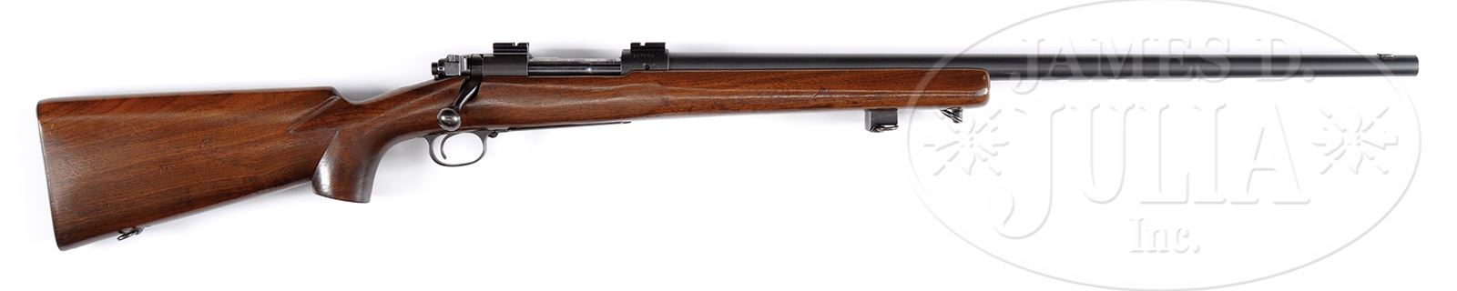 *WINCHESTER MODEL 70 BOLT ACTION TARGET RIFLE PRE-64.SN 107280. Cal. 220 SWIFT. 26″ heavy bbl, blue finish, plain walnut stock. PROVENANCE: William Henkel Collection. CONDITION: Very good. Bbl retains 90% matte blue finish thinning at the muzzle with slight mar on the left side in front of stock. No sights. Bore is frosty with strong rifling. Receiver retains 90% matte blue finish with Weaver scope blocks attached. Bolt handle shows 80% blue turning plum. Bottom metal shows 60% blue with some staining and scratches. Stock is very good with handling marks commensurate with age of gun. Plain pistol grip, steel buttplate. Sling swivels with a hand rest attached to the forestock. Nice target rifle. 49394-36 TEP (1,500-2,000) – Lot 1431