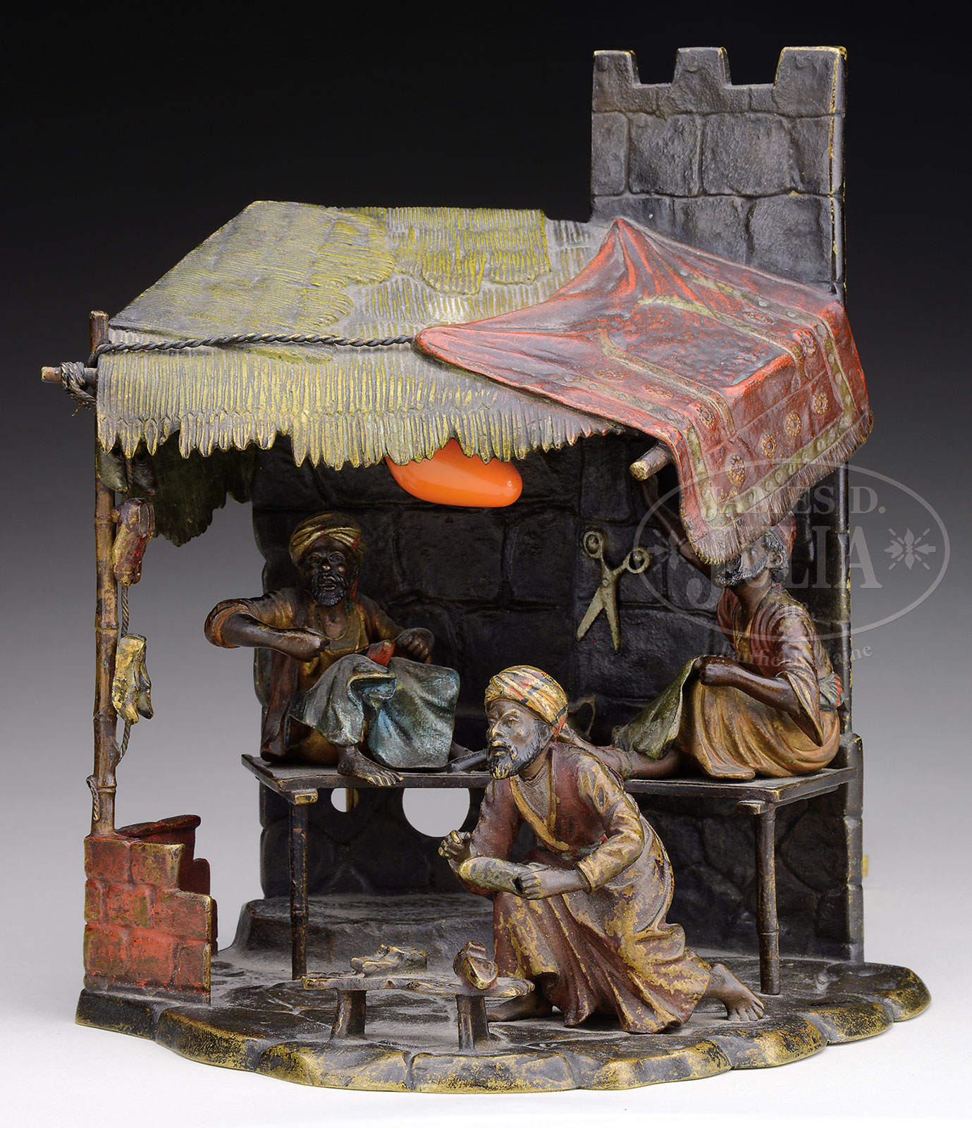 ATTRIBUTED TO FRANZ BERGMANN (Austria, 1861–1936) COLD PAINTED BRONZE COBBLER SHOP LAMP.Bronze Unsigned, base with impressed mark AUSTRIA Note: Illustrated on page 200 Antique Vienna Bronzes By Zobel SIZE: 9″ h x 9″ w x 6-1/2″ d CONDITION: Overall very good, original surface, paint and with good patina 51911-60 (4,000-6,000) – Lot 1431