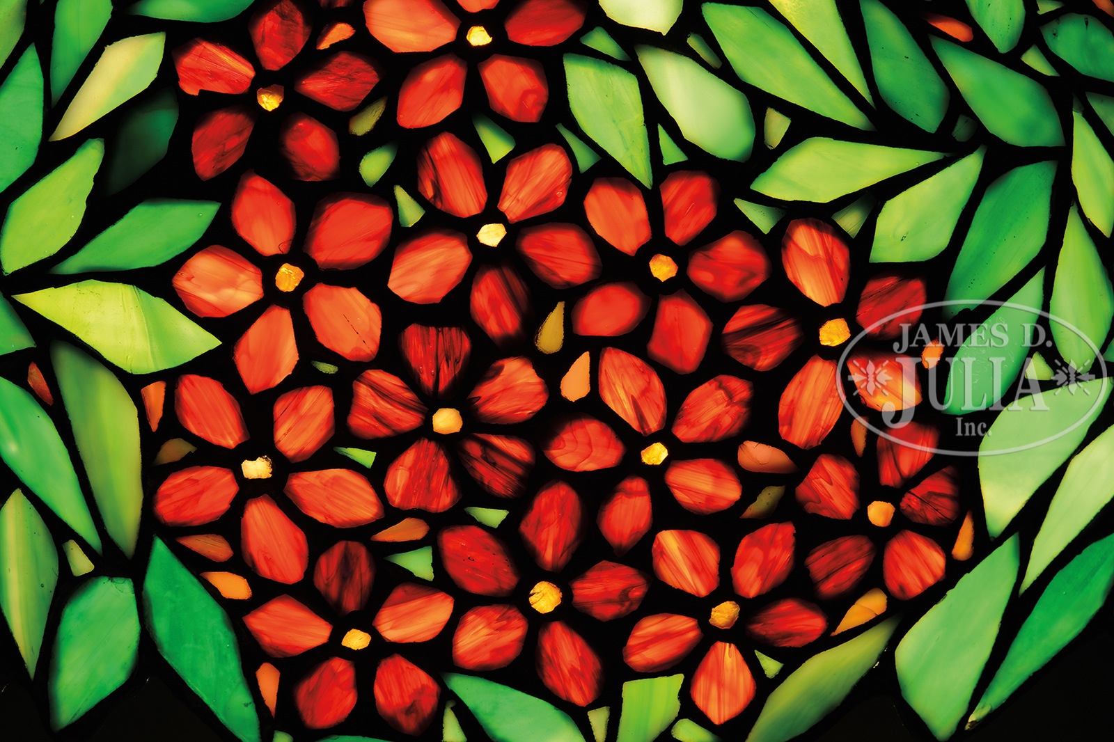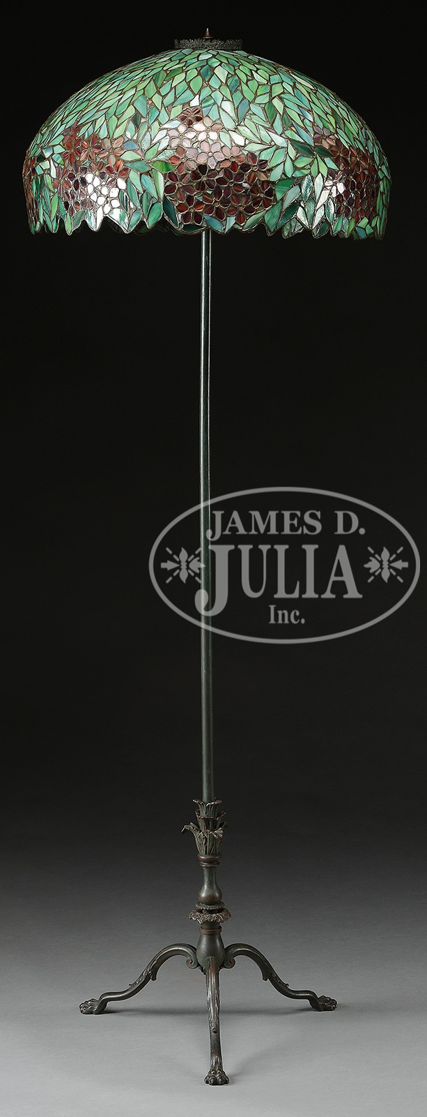 UNIQUE CHERRY BLOSSOM FLOOR LAMP.Leaded glass shade by Unique Art Glass and Metal Company has deep red cherry blossoms surrounding edge of shade. Cherry blossoms are surrounded by striated green, yellow and white stylized leaves which also create an irregular border. Unsigned. Shade rests on cast bronze base with 3 curving legs terminating in lions paw feet, each leg has an acanthus leaf knee. Base has 5 socket cluster and is finished in brown patina with green highlights. Base is topped with cast bronze stylized floral ring. Unsigned. SIZE: Shade 23″ dia. Lamp 64″ t. CONDITION: Shade has 2 replaced panels at the aperture along with solder repair to same area and several panels around shade appear to have been glued back into place, a few tight hairlines, otherwise good. Base is very good to excellent with some minor wear to patina. 49777-8 (5,000-7,000) – Lot 1432