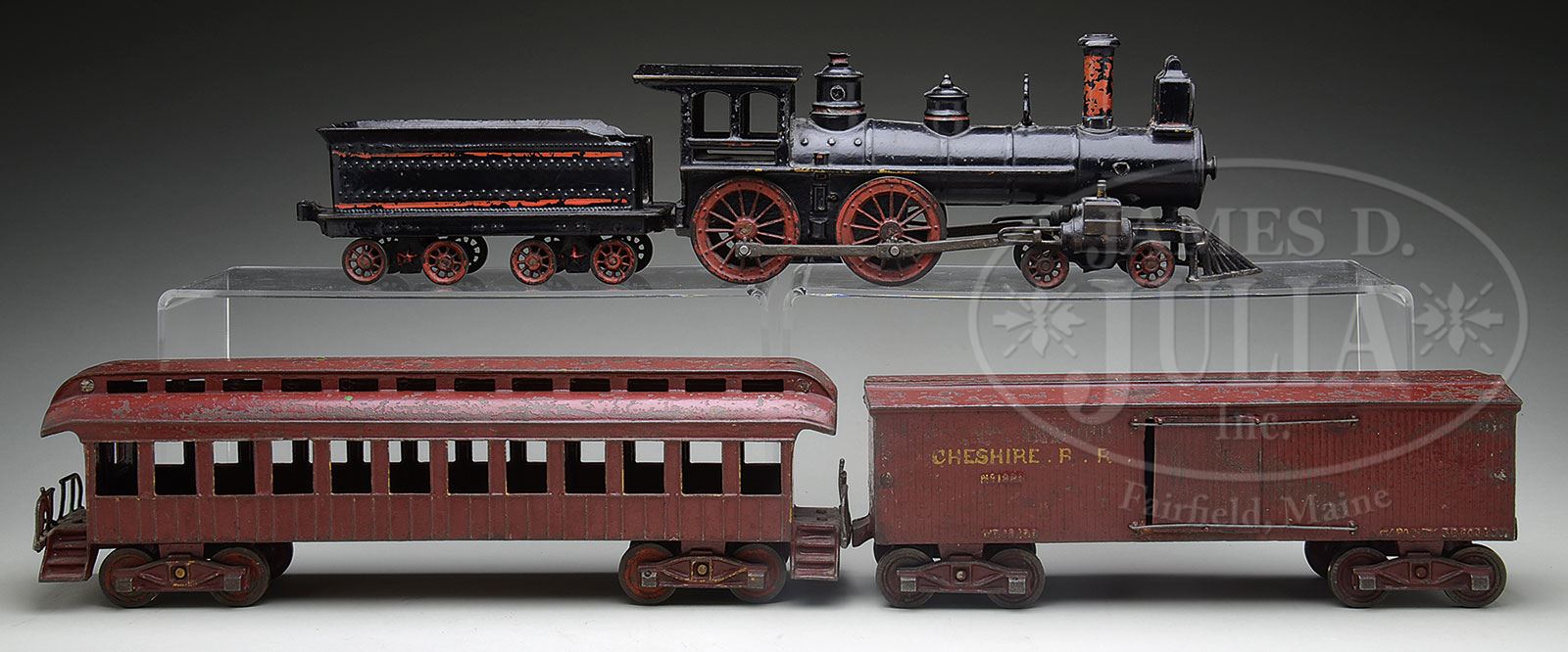 USA. Late 1800s child’s floor train features heavy cast iron locomotive, coal tender, boxcar, and large passenger car. Box car is marked “Cheshire R.R.” SIZE: Locomotive 13″ l. Overall 48″ l. CONDITION: Missing bell on locomotive. Paint is good plus on all pieces. No breaks, cracks or chips on casting apparent. 1-14549 (800-1,200) – Lot 1433