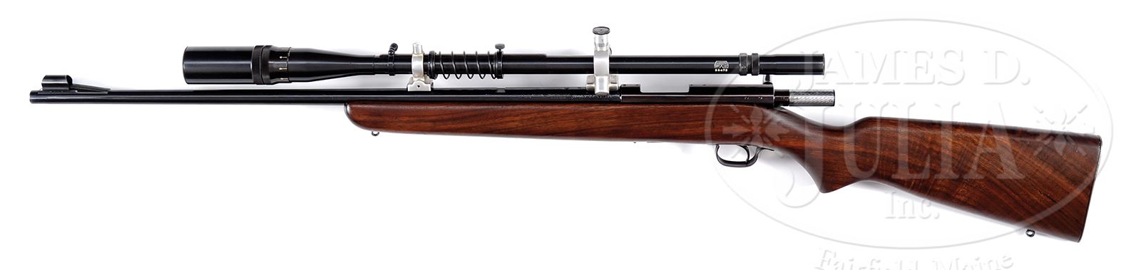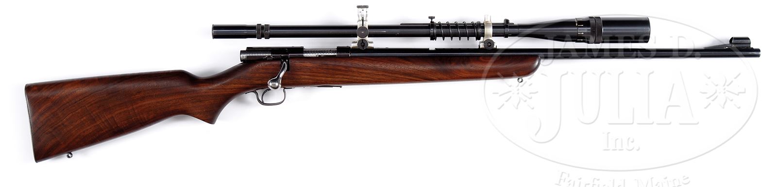 *WINCHESTER MODEL 43 BOLT-ACTION RIFLE WITH “J. UNERTL” TELESCOPE.SN 43681A. Cal. 218BEE. 24″ bbl, blue finish, nicely figured walnut stock with shotgun butt and Winchester sling eyes, Unertl Optic Co. Telescope #52473 with Unertl bases. CONDITION: Very fine as professionally refinished. Bbl shows 95% blue with slight muzzle wear and a few small scratches. Bore is bright with sharp rifling. Receiver shows 95% plum-blue finish with only minor high point wear. Bolt has been engine turned. Bolt handle is polished bright. Trigger guard shows 50% orig blue turning plum-brown. Magazine shows 50% blue with clear “M 43, 218BEE” mark. Pistol grip stock is very good with only some minor handling marks. Steel buttplate is very good with 50% blue. Unertl telescope is fine with clear optics and only a few small handling marks. Unertl mounts are adjustable for windage and elevation. A very nice M 43 target rifle. 49527-13 TEP C&R (600-1,000) – Lot 1433