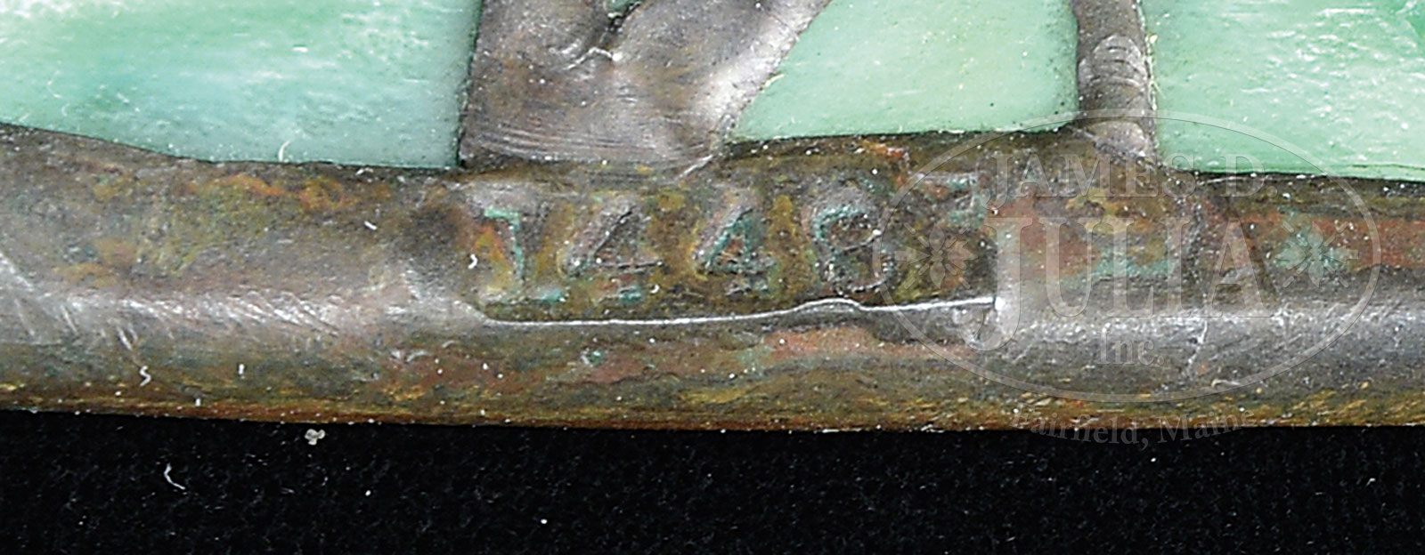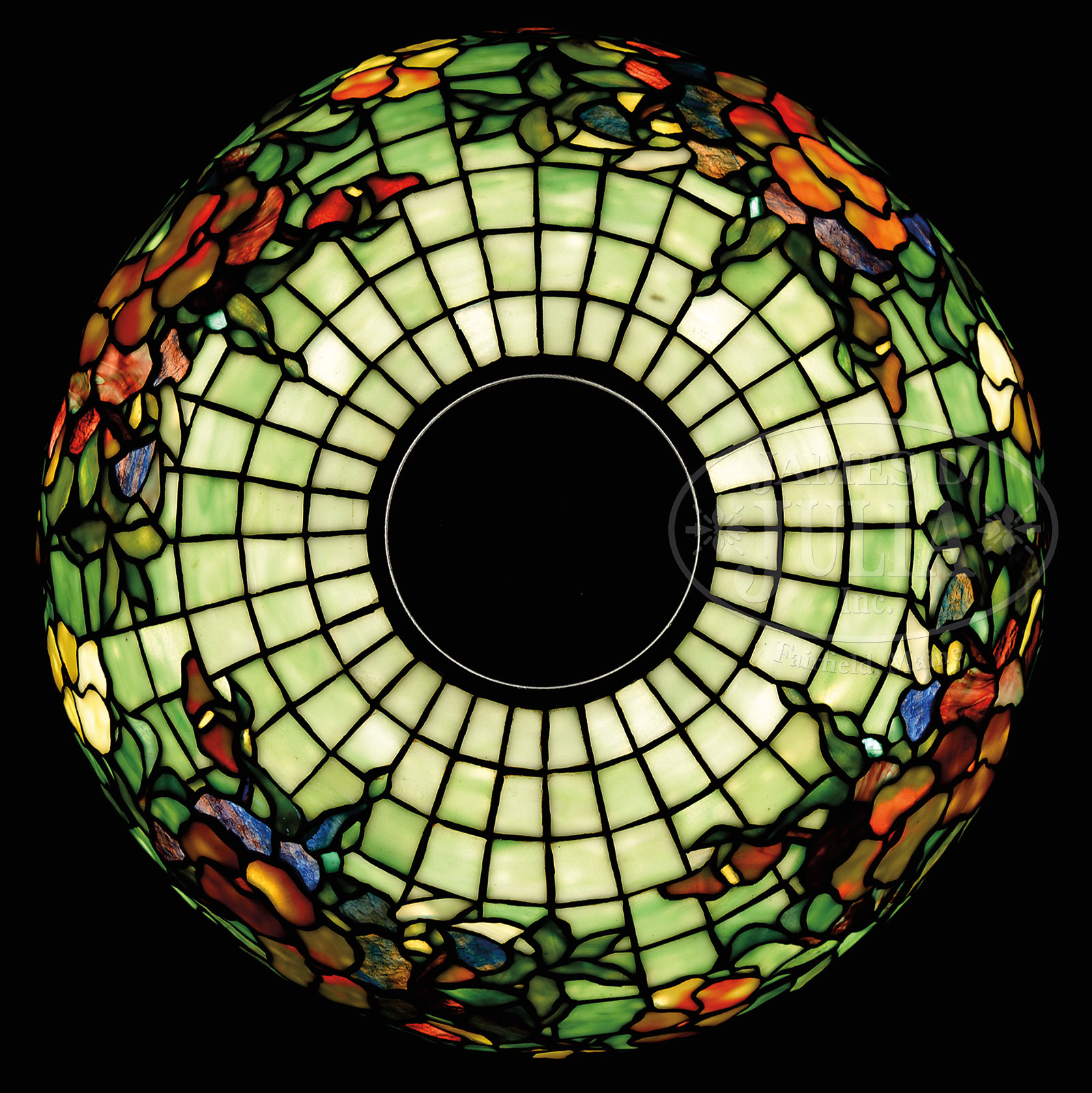 TIFFANY STUDIOS PANSY TABLE LAMP.Tiffany Studios table lamp has yellow, red and orange pansies surrounding the shade with mottled green and blue leaves. All set against a light green and cream striated geometric background. Many of the pansy petals are done in brightly colored granite glass giving a great deal of life to the pansies. Signed on the inside rim “Tiffany Studios New York 1448”. Shade rests on Tiffany Furnaces base with green Tel el Amarna stem. The glass stem is finished with an applied Tel el Amarna collar with gold iridescent and cream overlapping wave design. The base is complete with bronze decorated foot along with a bronze stem and replacement cap, two socket cluster and shade ring. Bronze is finished in a rich brown patina with green highlights. Signed on the underside “Louis C. Tiffany Furnaces Inc. 137 S L”, stamped on top of socket cluster “Patd. 1-18-10 9-20-10 10-26-15 1-20-20 Benjamin 250W. 250V”. There is also a note on the bottom of the base stating that the Tel el Amarna glass is signed “L.C. Tiffany-Favrille 7599F”. The glass signature is covered by the bronze foot and we have not removed the foot to confirm that signature. SIZE: Shade 16″ dia. Lamp 21-1/2″ t. CONDITION: Shade is very good to excellent with some tight hairlines and no missing glass. Base is very good to excellent. Re-wired with appropriate cloth cord. Cap is missing its threaded rod. 51149-4 (35,000-55,000) – Lot 1433