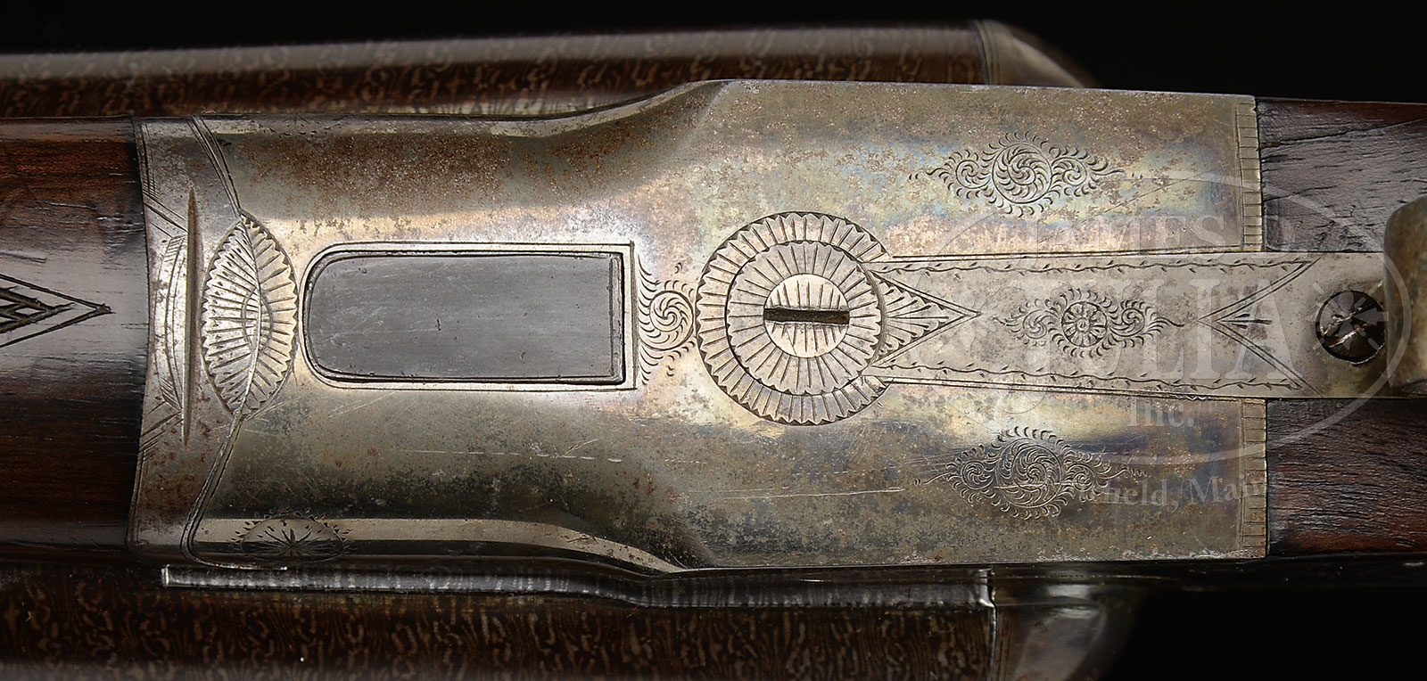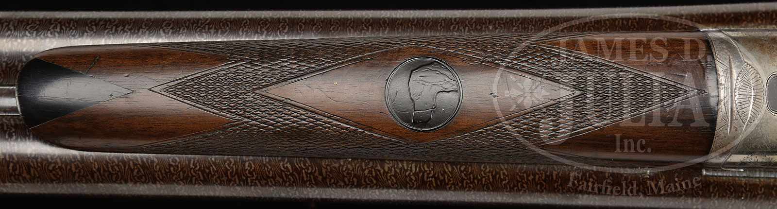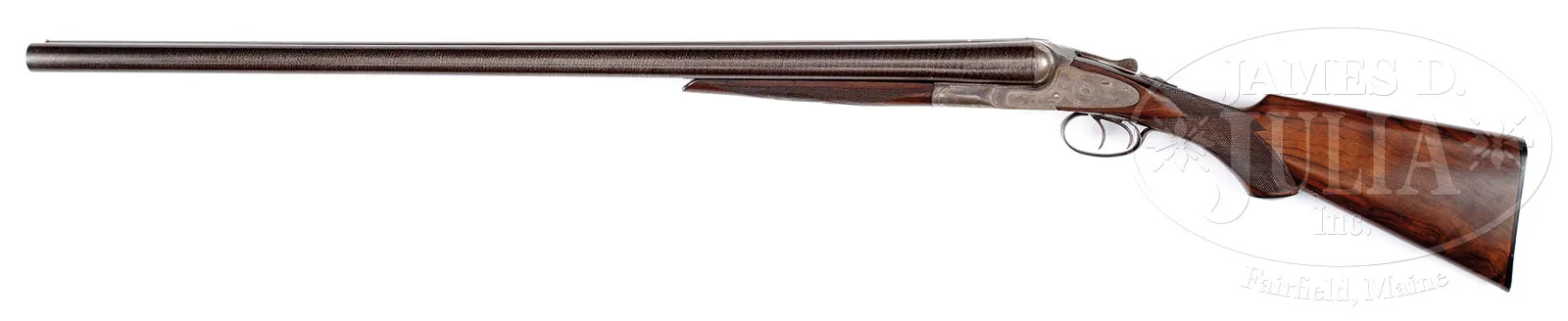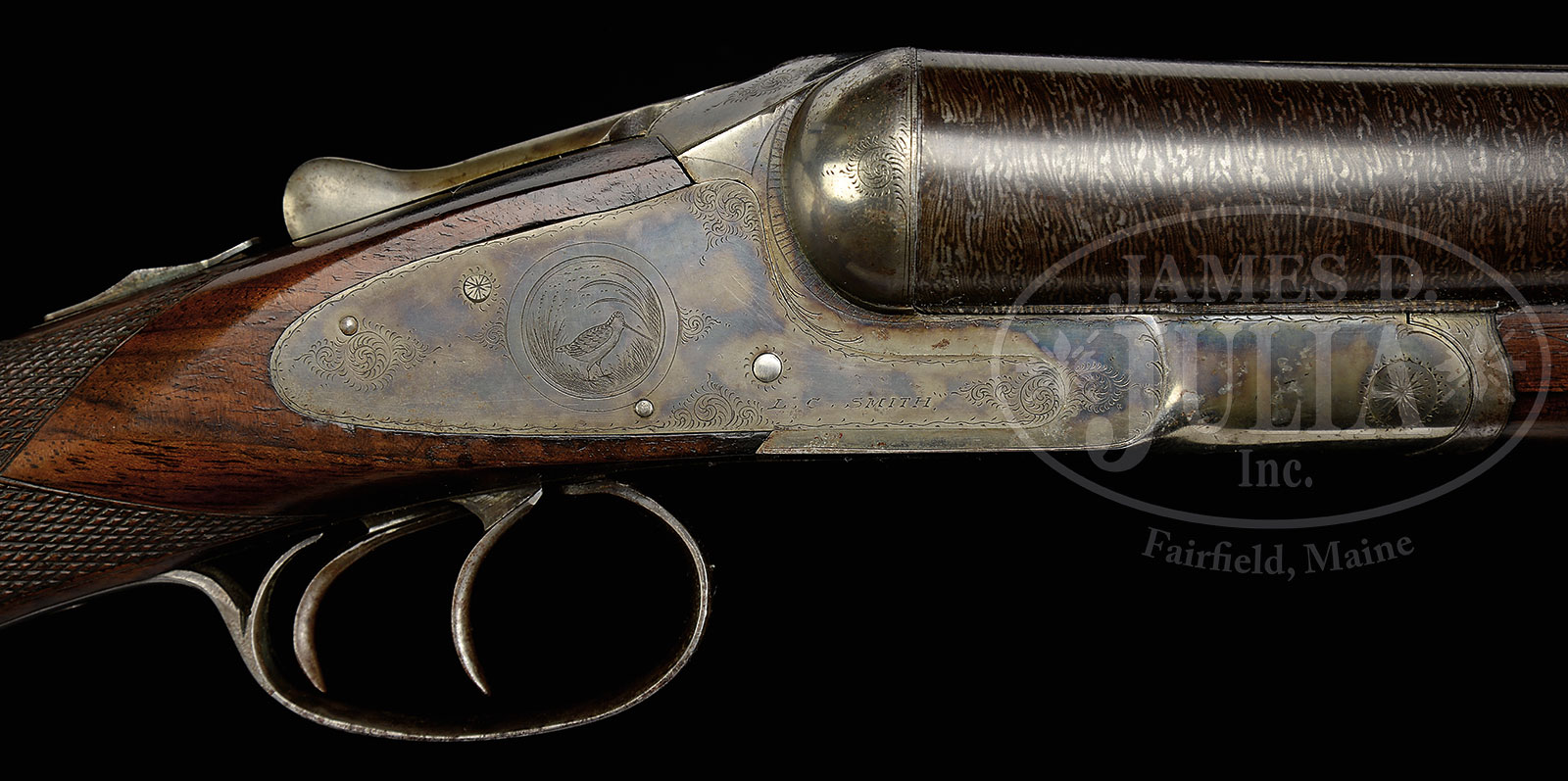 OUTSTANDING GRADE-2 L.C. SMITH 8 GA SHOTGUN.SN 91781. Cal 8 ga. 32″ chain Damascus bbls with full length matted to rib and brass front bead. Rib with small gold ribband marked “Hunter Arms Co., Makers. Fullton, N.Y.”. Extremely large frame, dbl triggers, extractor, auto safety. Capped full pistol grip buttstock checkered in two-point pattern with 13-1/2″ LOP over serrated lined HRBP. Splinter forearm checkered in three-point pattern with hard rubber dog’s head escutcheon and triangular shaped ebony tip. Receiver is nicely engraved in typical early Grade 2 pattern with snipe in circle on right, quail in circle on left surrounded by light scroll engraving and marked “L.C. Smith” on sides. Dbl fastened trigger guard tang with SN noted and burst of scroll on bow. Weight: 12 lbs. 4 oz. CONDITION: Excellent and easily one of the nicer 8 ga L.C. Smiths this cataloger has examined. Bbls retain nearly all of an expert quality restored brown and white contrasted pattern by master gunsmith Buck Hamlin. Receiver retains 50-60% nice orig case hardening with minor staining and toning and one quarter sized area on bottom left of front action. Forearm is very good. Checkering lightly thinned as is escutcheon. Minor age crack in ebony tip. Buttstock is excellent with minor handling marks and scratches and retains most of what appears to be its orig finish. Buttplate is very good with a minor repair at toe. Bores are bright and shiny with minor orange peel. Mechanics are crisp. A rare gun in high orig condition with approx 31 made according to Houchins. 51428-1 JSL (15,000-22,500) – Lot 1434 Click here to view provenance