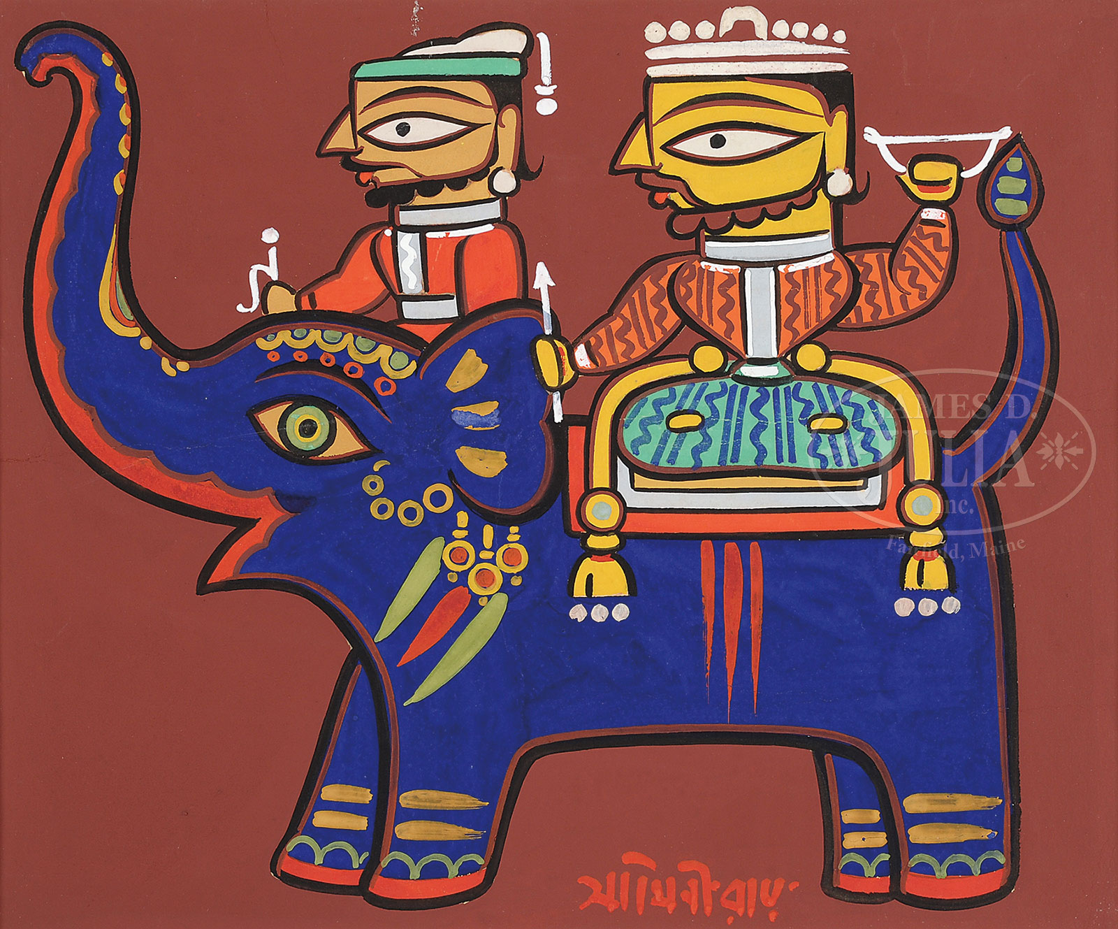 JAMINI ROY (Indian, 1887-1972) TWO MEN ON ELEPHANTS.Gouache on card stock Unframed Signed lower center, inscribed on verso “Kemple Thu” and numbered “8158” SIZE: 13-1/4″ x 15-1/2″. Overall: 17-1/2″ x 20″ PROVENANCE: Consignor reports the work was purchased in Calcutta by his father, an American engineer working in Dhaka, East Pakistan in the 1960’s CONDITION: Minor cracking to paint lower right with small amounts of loss, several small losses to white pigment in collar, surface abrasion in elephant’s face, taped to front mat on verso 35 51713-1 (8,000-12,000) – Lot 1434