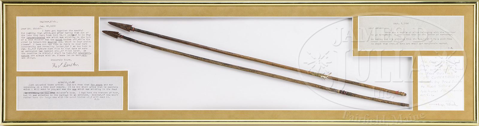 TWO EXTREMELY RARE INDIAN ARROWS FROM THE CUSTER BATTLEFIELD WITH GOOD PROVENANCE.These 2 arrows are illustrated in Fred Dustin’s book written in 1939 A Custer Tragedy on p. 194, fig. 4. Dustin corresponded with and interviewed a number of surviving Indians, civilian interpreters, and soldiers starting in the early 1900s for compilation of their personal narratives of the 1876 fight at Little Bighorn. He spent over 30 years researching the battle and its participants. Dustin was known for his disdain for Custer and criticism of his actions, and his support for the controversial Major Marcus Reno. Ironically, he made his only visit to the Custer Battlefield in 1938. The following year, he published his life’s research in a work entitled The Custer Tragedy: Events Leading Up to and Following the Little Big Horn Campaign in 1876, a work considered a classic in Custeriana. There is a series of correspondence between Fred Dustin and a collector in the 1950s elaborating the history dating back to John Gibbons who was the first to bury the dead on the battlefield. “…I have two steel-pointed arrows picked up on the field by a soldier who was there (whether of the 7th Cavalry or of Gibbon’s command, I do not know of have forgotten). One was sticking in the body of a dead soldier, the other lying on the ground. I offered them (Maj. Luce, Custer Battlefield collection) but never got a reply, so I think they will go to the Yale College collection”. This quote was from an April 20, 1954 letter from Dustin to Hugh Shick. This letter as they say, “got the ball rolling”. Several other letters pertain to these gifts finally given from Schick to Dustin. In a February 5, 1955 letter from Dustin to Schick “You ask-“How long can I keep it?” (the arrow). As long as you wish, but I hope you will pass it on to some worthy permanent institution, but NOT to Maj. Luce or his successor. The “Custer Battlefield Museum” is simply a George A. Custer collection-NOT a Custer Battlefield Museum at all…I am under the impression that the soldier who found the arrows was a member of Gibbon’s infantry…”Dustin was almost 90 years old when he wrote this letter and finally forwarded the arrows with a note dated September 3, 1956 just months before he died (the original candlebox used for shipping Schick had is also here. Interested parties should read the letters and correspondence from Dustin on website catalog. Fred Dustin’s papers are at the University of Michigan.” PROVENANCE: Fred Dustin, Hugh Shick 1956, Glen Swanson Collection, Don Nidiffer, Signature House Auction June 27, 2000, Lot 131. CONDITION: Arrows are as found and as described in letters. One missing an ear of its notch and only the base of the feathers still retaining sinew attaching them and sinew attaching tips. There are several twists of a more recent red thread holding sinew tight. These few wraps of red thread could be easily removed and were probably only added when framed. Shafts have great hand worn patina and small metal heads with iron patina with rust. The smaller of the 2 arrows measures 23-3/4″, the larger 24-1/4″. The arrows are framed between 2 pieces of plexiglass with the original tags from Dustin framed with them along with note from Hugh Shick written on back of photograph showing 1 arrow. 4-55013 JS105 (20,000-30,000) – Lot 1435 Click here to view provenance