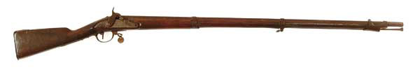 J. P. MURRAY CONVERSION OF 1777 CHARLEVILLE FLINTLOCK MUSKET. NSN. Cal. .75, 42-3/4″ bbl. “CityGuard” is branded into the bottom of the stock in front of the triggerguard, as per Dr. John Murphy’s Book “Confederate Rifles and Musketoons”. Conversion hammer appears to be identical to that shown on page 541 of Murphy’s book. CONDITION: Deeply pitted over all. Stock is good with minor chips around the buttplate. Nipple is smashed flat and the hammer is loose. 4-47487 (2,000-2,500)