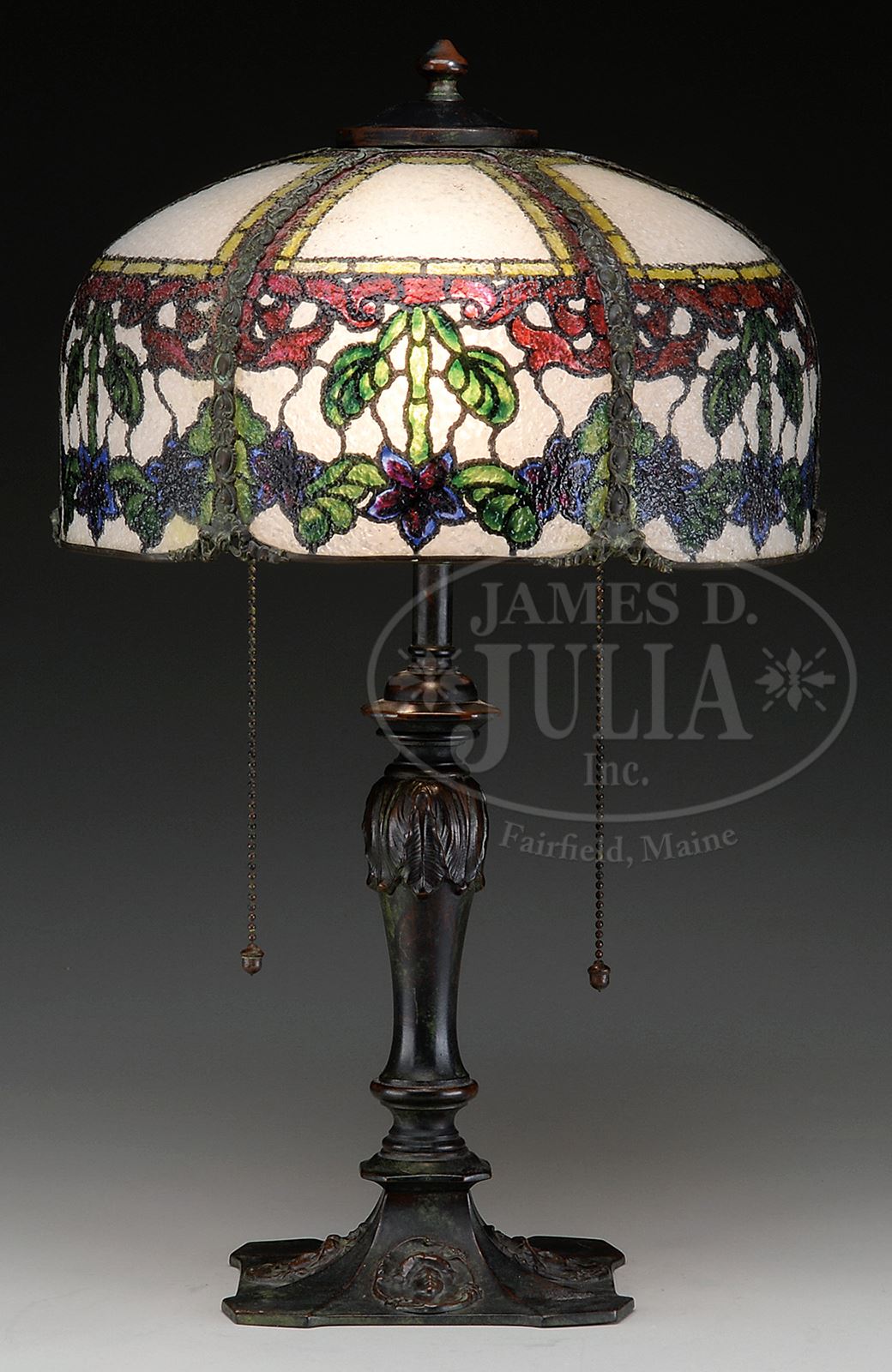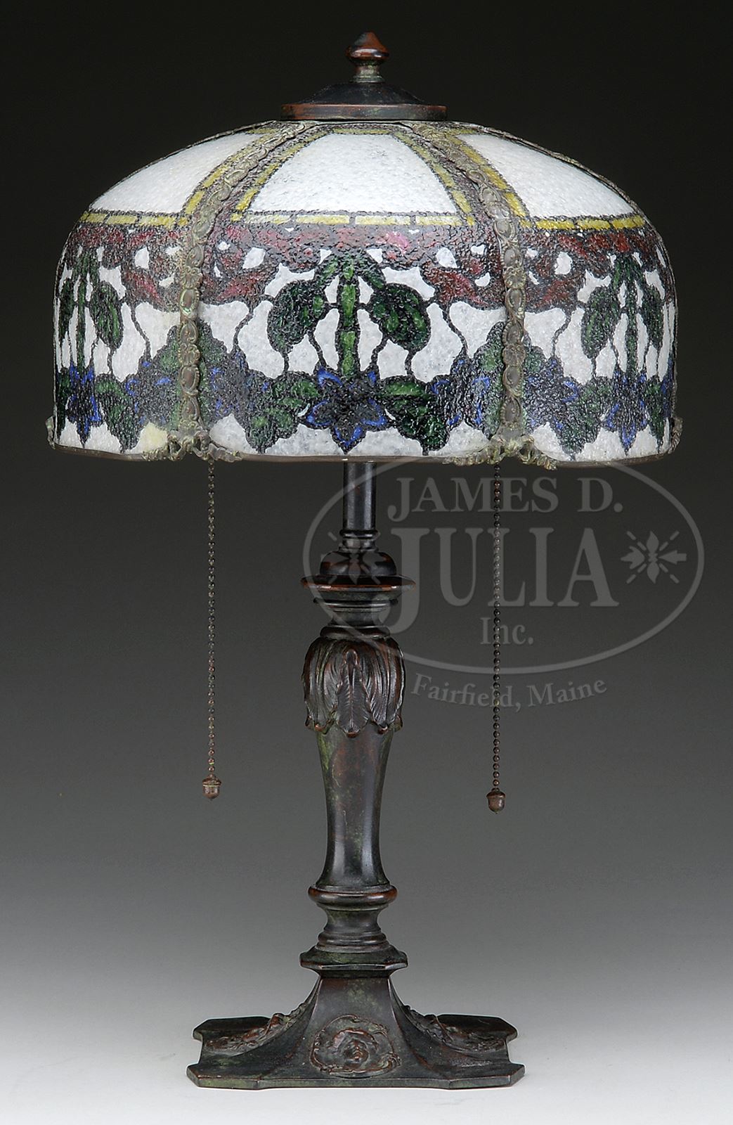 MORGAN REVERSE PAINTED TABLE LAMP.John Morgan & Sons modern stained glass lamp has six bent panels with reverse painted floral design. Designed to resemble leaded glass, bent panels are made of skylight glass which is stippled on one side and smooth on opposite. Smooth side is painted while stippled side diffuses light allowing panels to look more like leaded glass. Unsigned. Shade rests on cast metal base with four cast cartouches of art nouveau ladies heads on each section of square foot. Stem is cast with acanthus leaf design, simple riser leads to two-socket cluster. Base is finished in rich bronze tone. Unsigned. SIZE: Shade is 11-3/4″ dia. Lamp is 19-1/2″ t. CONDITION: Shade is very good to excellent. Base is very good with some minor wear and discoloration to finish. 50514-7 (1,200-1,500) – Lot 1437