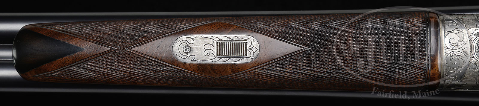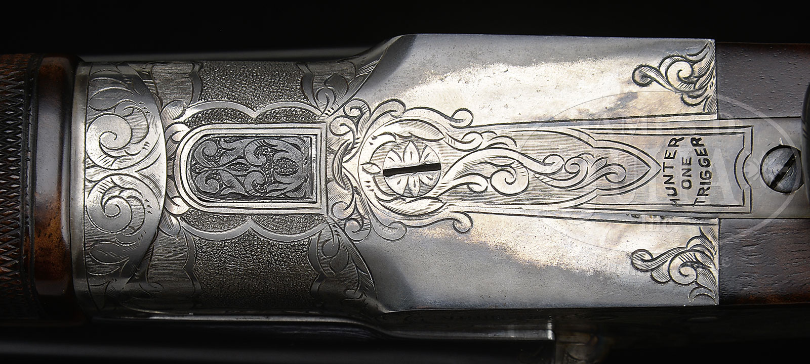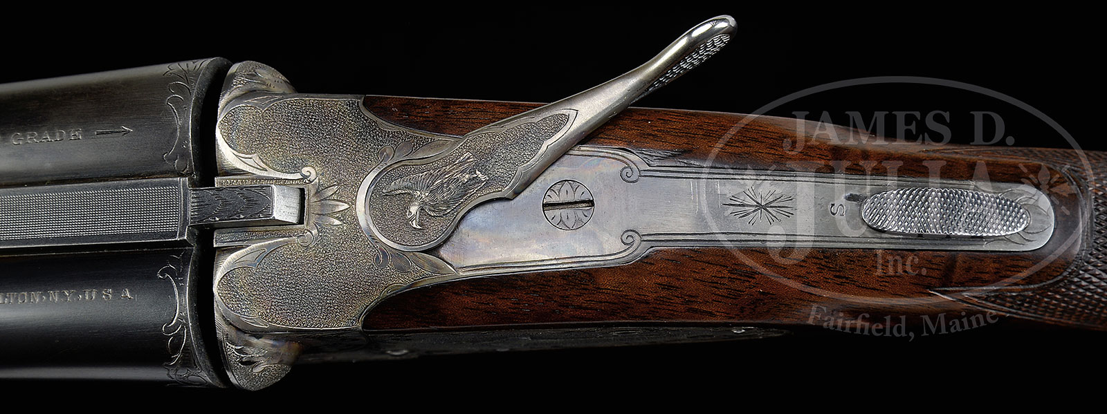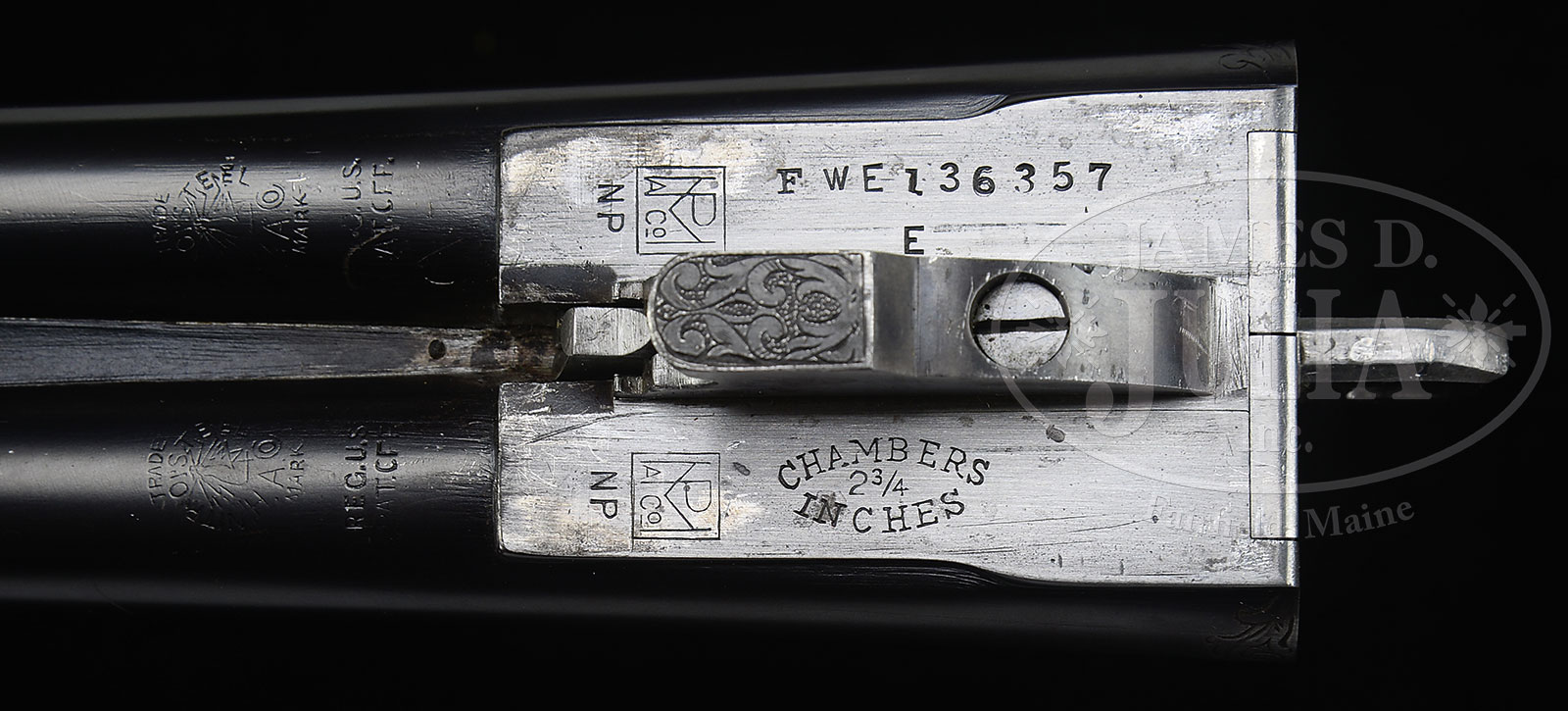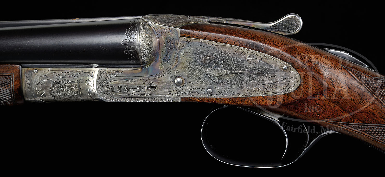 *SUPERB AND RARE L.C. SMITH EAGLE GRADE 20 GA FEATHERWEIGHT EJECTOR SHOTGUN.SN FWE136357. (ca 1932) Cal. 20 ga. 2-3/4″Chambers. 26″ Nitro steel bbls are rolled with “L. C. SMITH Eagle GRADE” on top right, and “HUNTER ARMS CO INC M’F’R’S FULTON, NY, USA” on top left. Bbl flats are stamped with SN, “E”, Hunter proofs, and for 2-3/4″ chambers. Featherweight action features non-automatic safety, Hunter selective “One Trigger”, and automatic ejectors. Action is engraved in typical Eagle Grade patterns with scroll highlights surrounding semi-relief renderings of flying pheasant on left lock, duck on right, and with perched eagle on top lever. Fine fancy figured American walnut capped pistol grip point pattern checkered buttstock measures 14-1/2″ over ribbed composition buttplate. A gold oval on toe line is engraved “E. M. F.” Matching splinter ejector forend has inset ebony tip and secondary ejector latch. Bore diameter: left -.612, right -.611. Bore restrictions: left -.014, right -.007. Wall thickness: left -.027, right -.028. Drop at heel: 2-1/2″, drop at comb: 1-9/16″. Weight: 5 lbs. 15 oz, LOP 14-1/2″. CONDITION: Excellent. Bbls retain 90% of what appears to be orig blue, silvered at muzzles and breech ends, thinning from normal carry wear. Action retains most of its orig case hardening color, quite vivid where protected, silvered on bottom. Lockplates are somewhat stronger, perhaps 60 – 70%. Trigger guard retains nearly all of a properly restored blue. Stocks retain nearly all of an older hand rubbed finish over a number of older marks, checkering re-cut. Bores are excellent, bright and shiny. Action is tight. Ejectors and trigger are mechanically fine. A very scarce little gun, with only 580 produced in all gauges. 51751-5 JWD (10,000-15,000) C&R – Lot 1437