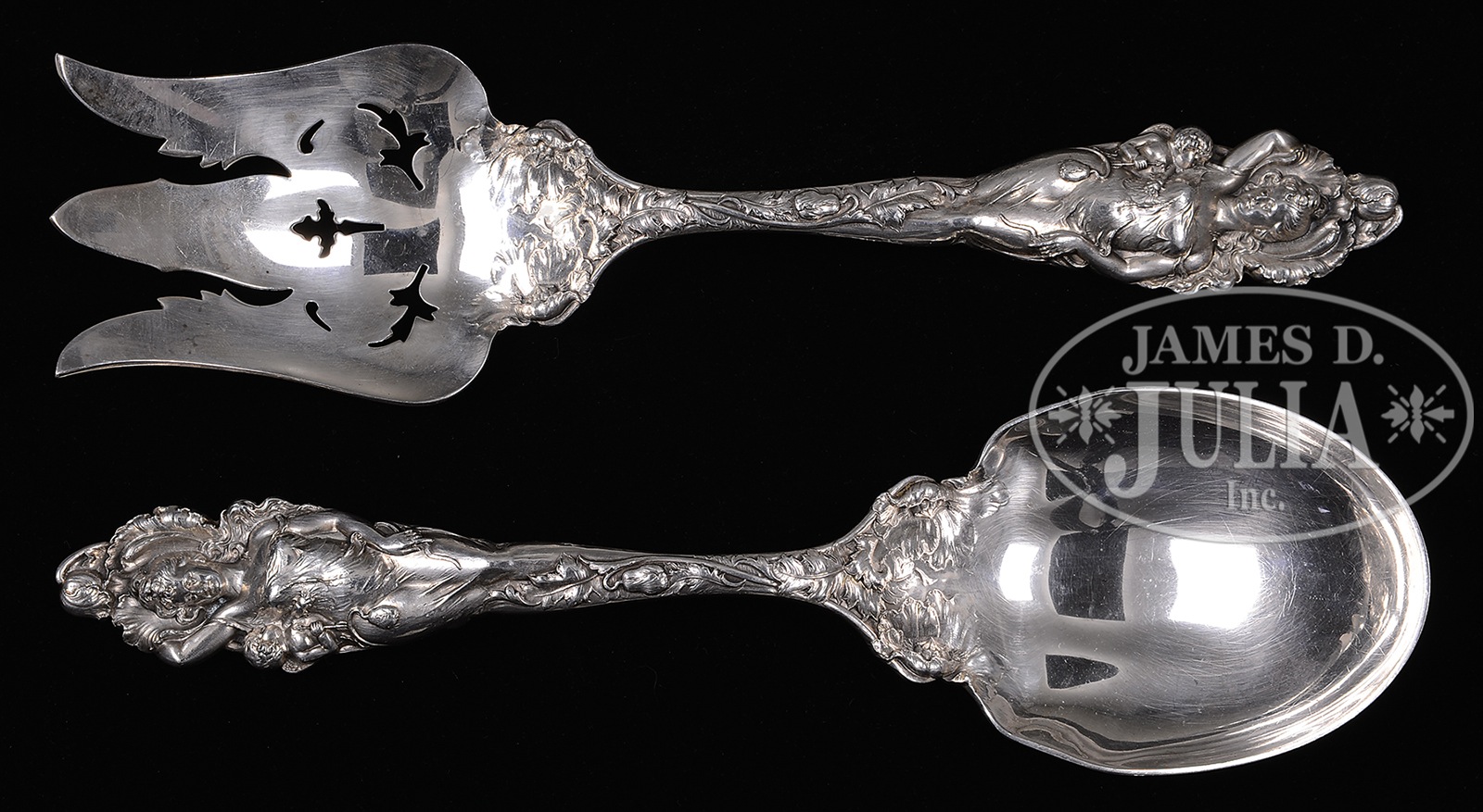 REED & BARTON STERLING SERVING FORK AND SPOON.Reed & Barton sterling silver serving spoon and fork in the Love Disarmed pattern depicts lovely Art Nouveau maiden with flowers and foliage growing around her and a small cherub by her side. The spoon and fork are stamped on the back “Sterling Pat. Apl’d For” along with the Reed & Barton hallmark. Total weight: 490 grams. SIZE: Each is 10-1/2″ l. CONDITION: Very good to excellent. 7-74303 (400-600) – Lot 1440