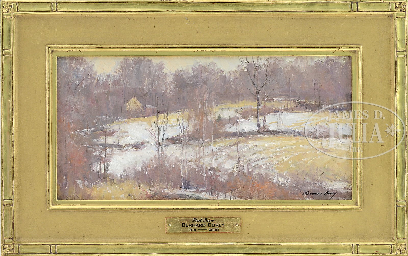 BERNARD COREY (American, 1914-2000) “FIRST SNOW IN THE FIELDS”.Oil on Masonite Housed in a giltwood frame with presentation plaque Signed lower right “Bernard Corey”, estate label on verso #BC210 SIZE: 7″ x 14″. Overall: 11-3/4″ x 12-3/4″ CONDITION: Very good to excellent 50519-5 (800-1,200) – Lot 1441