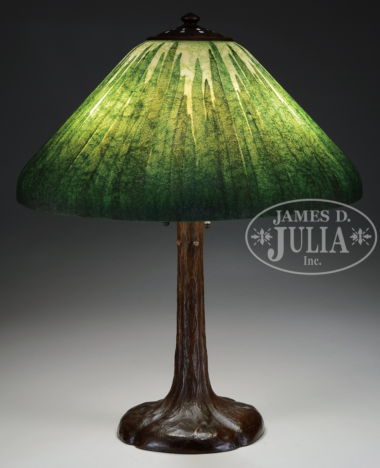 HANDEL REVERSE PAINTED TEROMA LAMP.Handel lamp has reverse painted Teroma shade with tall green grasses surrounding the shade against a cream colored background. Shade is signed on the interior “Handel 5357” along with a U.S. Patent number. Shade rests on a Handel tree trunk base with rich brown finish, three socket cluster and square cutout heat cap. Signed on the underside with impressed block letters “Handel”. SIZE: Shade 18″ dia. Lamp 22″ t. CONDITION: Shade is very good to excellent. Base is very good to excellent with some minor wear to finish. 48957-13 (7,500-9,500) – Lot 1443