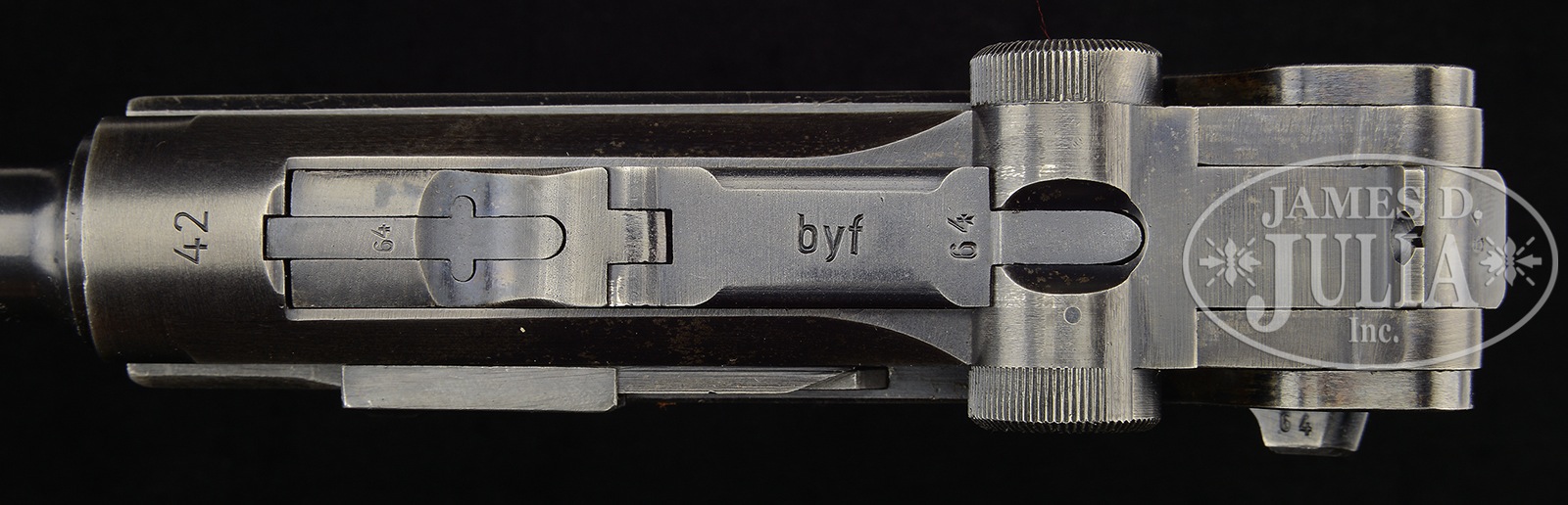 SN 4364. Cal. 9mm. 4″ bbl with Eagle/135 proof and 4 digit SN on bottom. “42” above chamber (manufactured in 1942). “byf” on center toggle link (manufactured by Mauser). Eagle/135 proofs on right receiver. Right checkered walnut grip is unnumbered, and left grip is mismatched. Other numbers on gun are matching down to firing pin. Mag is aluminum bottom Eagle/655 proofed ordnance replacement that is numbered to match and appears to have been done by a German armorer during the war. PROVENANCE: The Friedrich-Wilhelm Dauphin Collection, Germany. CONDITION: Very fine, retaining 95% orig blue that is fading in areas and has normal wear on edges and corners. Grips are lightly worn and darkened from oil. Bore is bright and sharp. Mechanics are fine. Mag has appropriate wear. 49829-63 BWS (1,500-2,500) C&R – Lot 1445