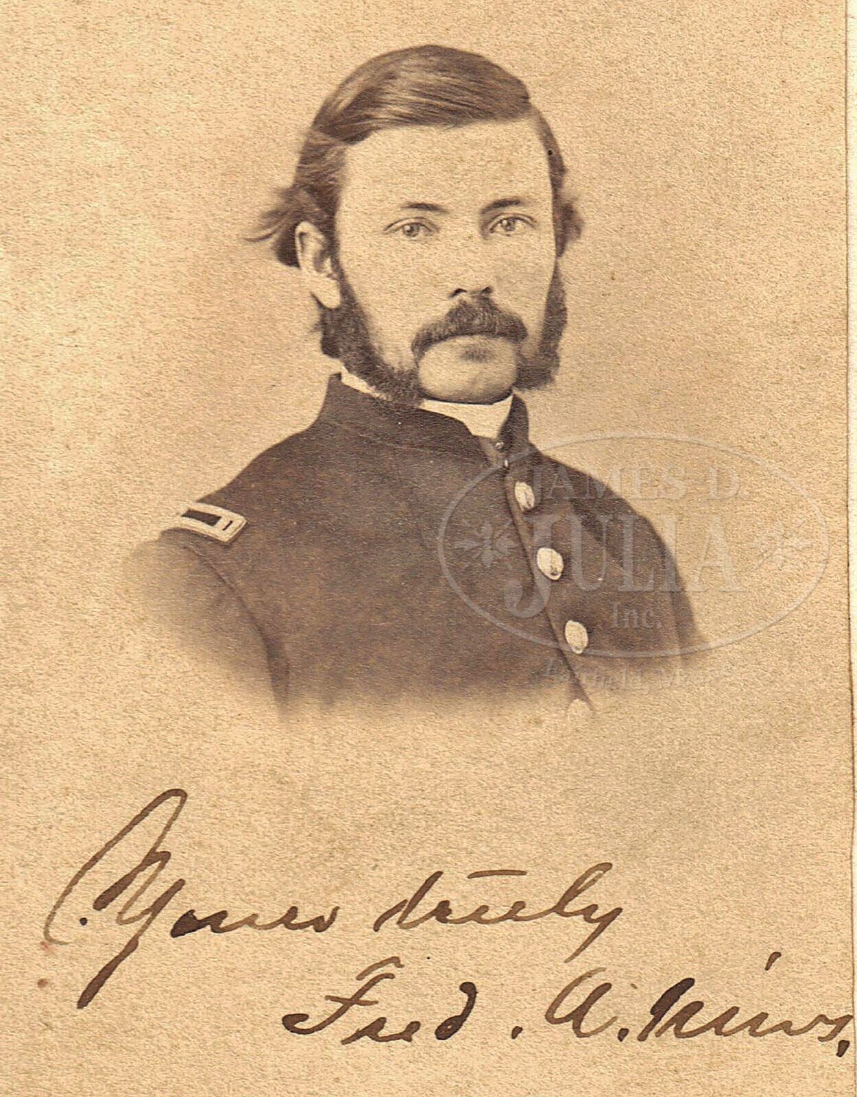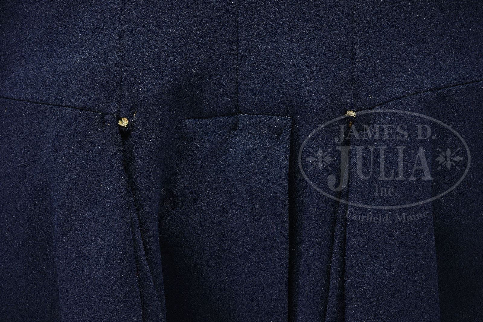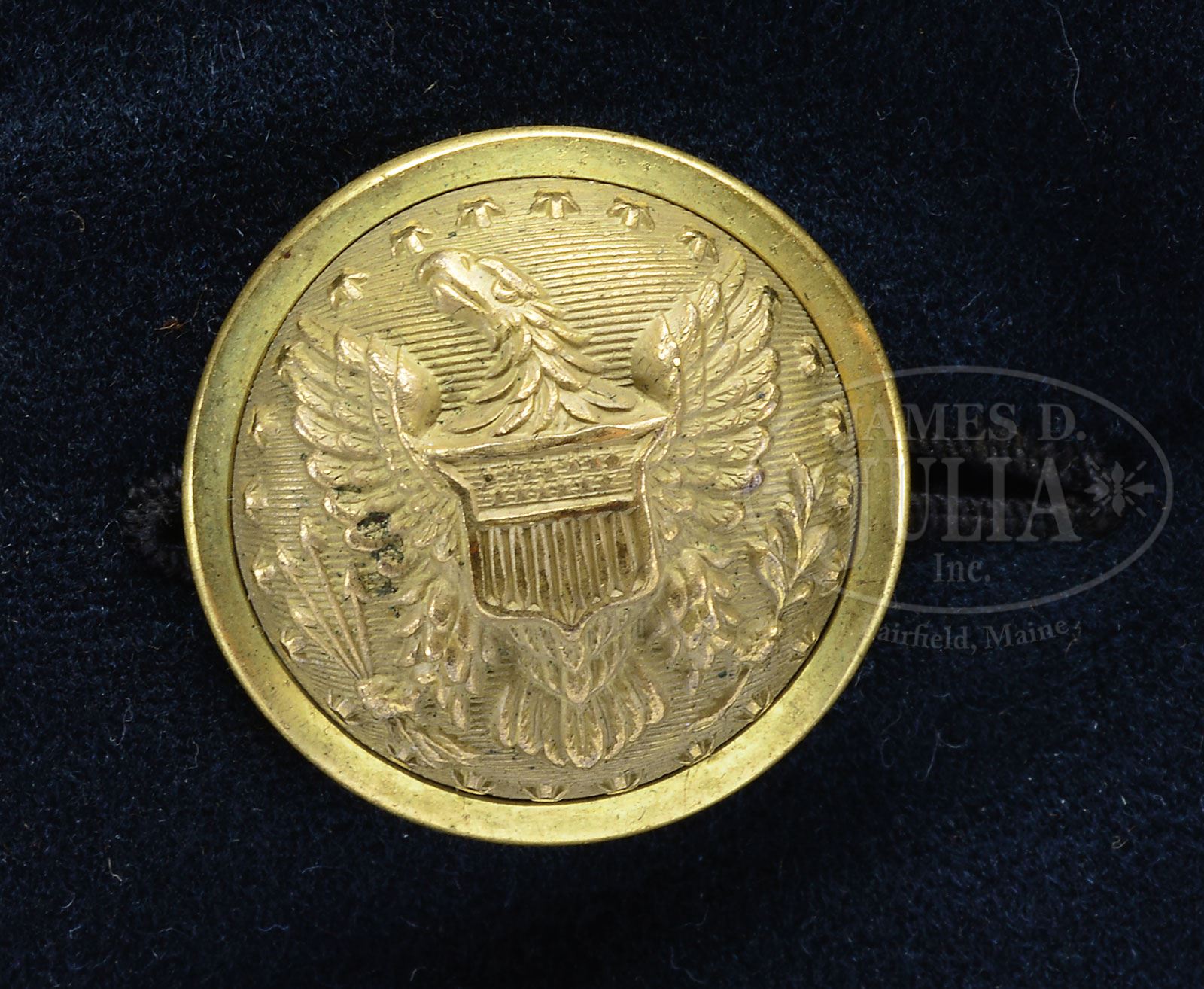 Frederick Nims was a childhood friend of George Custer being born in May 16, 1841 near Monroe, Michigan Custer’s home town. Nims entered service August of 1862 as a private in Company C, 5th Michigan Cavalry, he was 21 years old. Custer often promoted his friends to important positions in his inner circle that appears the case hereto. He was commissioned 2nd Lt. of Company F on January 12, 1864 and served as aide-de-camp on Custer’s staff from July to September 30, 1864. Nims is shown wearing this exact coat in only wartime CDV photos known. Nims is also shown sitting at Custer’s feet in famous group photo of his staff, Christmas Day, 1864, also in this same coat. David Ingall wrote a short biography on Nims for the newsletter of the Monore County Historical Museum, Volume 3, Issue 3, Page 3, 2008. “Lieutenant Nims fought alongside General Custer through most of the Civil War, from the Gettysburg Campaign to the surrender at Appomattox Courthouse, Virginia. The Nims sword that is in the Custer display at the Monroe County Historical Museum was taken by Frederick from a Confederate foe during the third days fight at the East Cavalry Battlefield of Gettysburg where the Fifth Michigan, as part of the Michigan Cavalry Brigade, defeated General Jeb Stuart’s Confederate Cavalry. He also participated in the Grand Review in Washington, DC and remained on General Custer’s staff after the war in Louisiana, Texas and Kansas.” Nims, along with another of Custer’s staff, James Kidd, served as the monument committee for the Equestrian Custer Monument unveiled in 1910. Coat is well made with polished green cotton lining, polished brown cotton pockets and sleeve linings, collar velvet lined. Cuffs measure about 5″ and elbows billow at 9″. This is a classic mid-war style coat with great aesthetics and color, with great provenance and direct family descent associated with one of America’s most iconic generals. PROVENANCE: Frederick Nims, Mrs. George V. Rhines (nee Annie F. Nims) 1921, donated to City of Toledo, November 5, 1938, de-accessed by Toledo Zoological Society, September 16, 1979. CONDITION: Fine overall. Coat has good color with hints of blue lining intact. Some stitching loose internally, cuffs and seams. Coat is missing tail buttons, though others intact. Cuff buttons are a mix of five staff and one enlisted with variety of back marks. Nine coat buttons are “EXTRA QUALITY”. Buttons and straps are re-sewn. 4-54475 JS (20,000-30,000) – Lot 1446