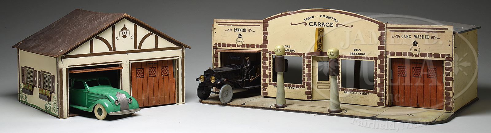 LARGE SERVICE STATION & GARAGE WITH VEHICLE.The only known example to this cataloger, this lot includes a fabulous garage by Rich Toys from the WWII era, made from stenciled Masonite. “Town & Country” service station shows washing bay, gas pumps and oil and greasing area. An additional residential two stall garage shows lift up doors, celluloid windows and paper litho window boxes. Lot also includes an appropriately scaled pressed steel Kingsbury Airflow green four-door sedan with windup action and battery operated headlights. SIZE: Largest building measures 33″ l. CONDITION: Buildings appear complete with light overall soiling. Airflow toy car has good to very good paint and is working. 1-14584 (400-700) – Lot 1447 Auction: Advertising, Toy & Doll Auction - Fall 2014 Please Note: All prices include the hammer price plus the buyer’s premium, which is paid by the buyer as part of the purchase price. The prices noted here after the auction are considered unofficial and do not become official until after the 46th day. |