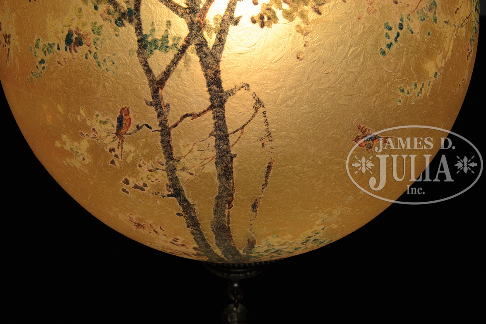 HANDEL BIRD IN FLIGHT HANGING LAMP.Handel hanging lamp has globe shade with obverse decoration showing groupings of trees surrounding the globe with colorful blue and orange birds flying between the trees all against a gold iridescent chipped ice background. Shade is housed in its original hardware with bronze tone finish and a cast metal tassel at the bottom. Unsigned. SIZE: Globe 9″ dia. 29″ from ceiling to bottom of tassel. CONDITION: Very good to excellent. Rewired with contemporary plastic cord. 48959-4 (3,500-4,500) – Lot 1447