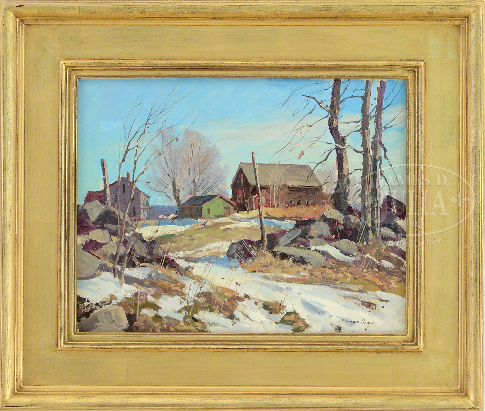 BERNARD COREY (American, 1914-2000) STONE WALL.Oil on Masonite Housed in modern giltwood frame Signed lower right “Bernard Corey” SIZE: 10-1/2″ x 13-1/2″. Overall: 16-1/4″ x 19″ CONDITION: Very good with 1/2″ area with loss of varnish & possibly with touch up 51972-2 (800-1,200) – Lot 1447