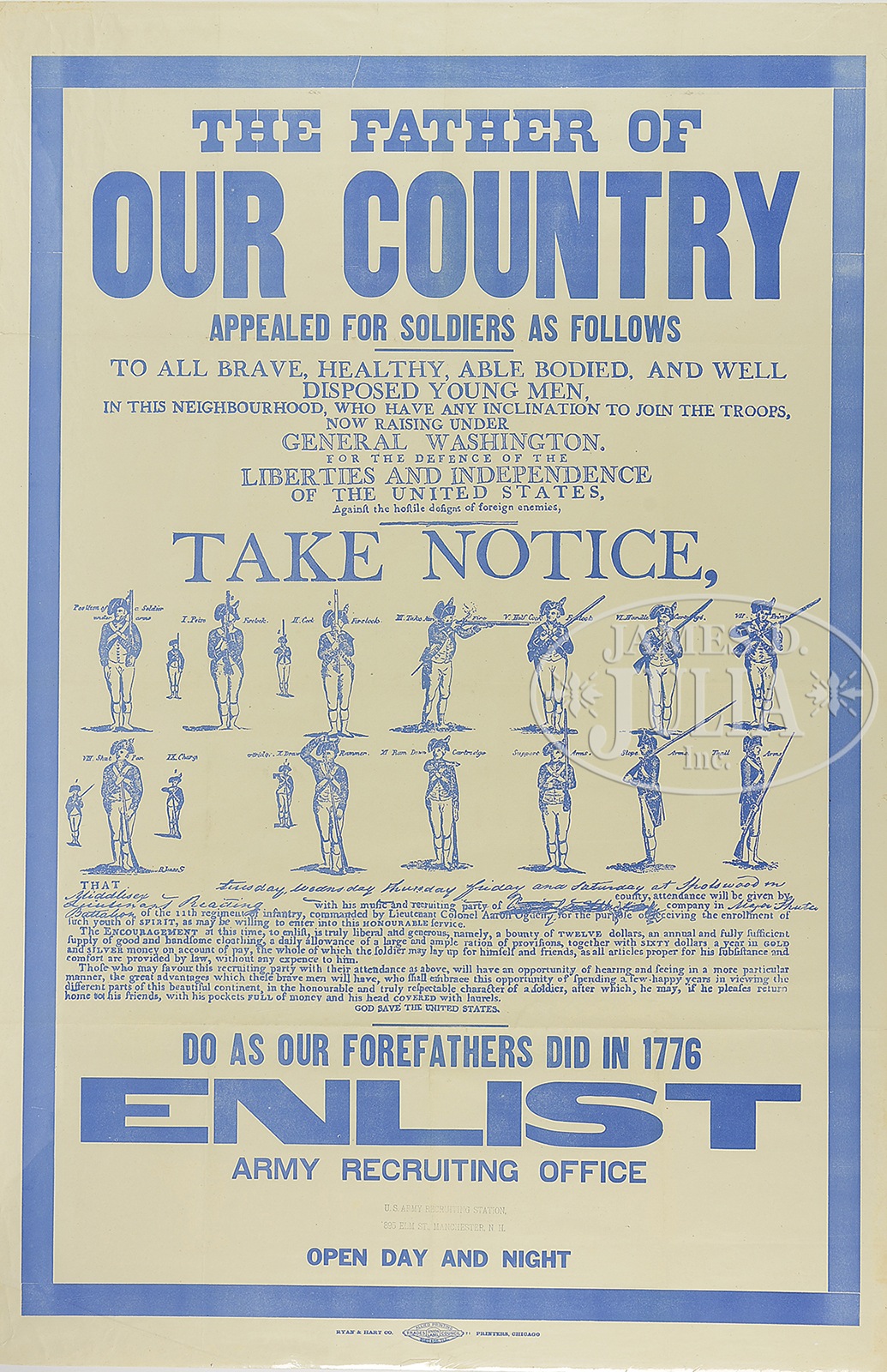 4 WWI POSTERS.1) “Notice of Enlistment”, published by Capitol City Press, Montpelier, V.T., featuring text and information about National War Savings Day. 2) “The Father of Our Country”, published by Ryan & Hart Co. Printers, Chicago. Rare poster featuring images of colonial soldiers. 3) “Jehanne” image of Joan Of Arc, hand colored print early 20th century, featuring Joan Of Arc on horseback in armor, signed in monogram, published by Pellerin et Cie, Imp. Edit. 4) “Britishers You’re Needed”, signed by artist Lloyd Myers, published by Albert Frank & Co., N.Y., Agents, for the British and Canadian Recruiting Mission, featuring image of a map with a soldier and a gentleman shaking hands. All 4 posters shrink wrapped on foam core. SIZE: 1) 38″ x 25″. 2) 42-1/2″ x 28″. 3) 34-1/2″ x 23-1/2″. 4) 41″ x 28″. CONDITION: 1) Very good, with minor stain, small tear and loss to corner. 2) Very good, with minor tears and fold to lower left corner. 3) Good, horizontal fold in center, some wrinkles and loss to right edge. 4) Very good, fly stains and minor edge losses. 9-96482 (1,500-1,800) – Lot 1448