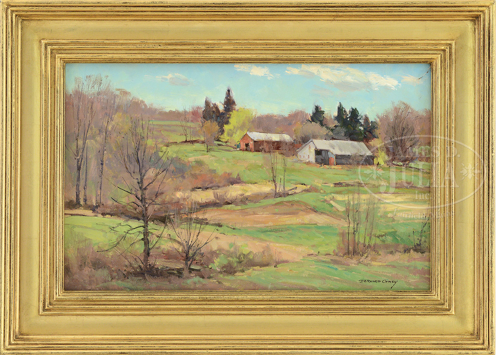 BERNARD COREY (American, 1914-2000) TWO WORKS: HOUSE AND BARN IN SUMMER & SUMMER LANDSCAPE WITH RED BARN.Oil on canvasboards Both housed in modern giltwood frames Both signed lower right “Bernard Corey” and “#49 ” on verso SIZE: 1) 10″ x 14″. Overall: 16″x 20″ 2) 10″ x 16″. Overall: 14-1/2″ x 20-1/2″ CONDITION: Very good 51972-3, 51972-6, (1,500-2,500) – Lot 1448