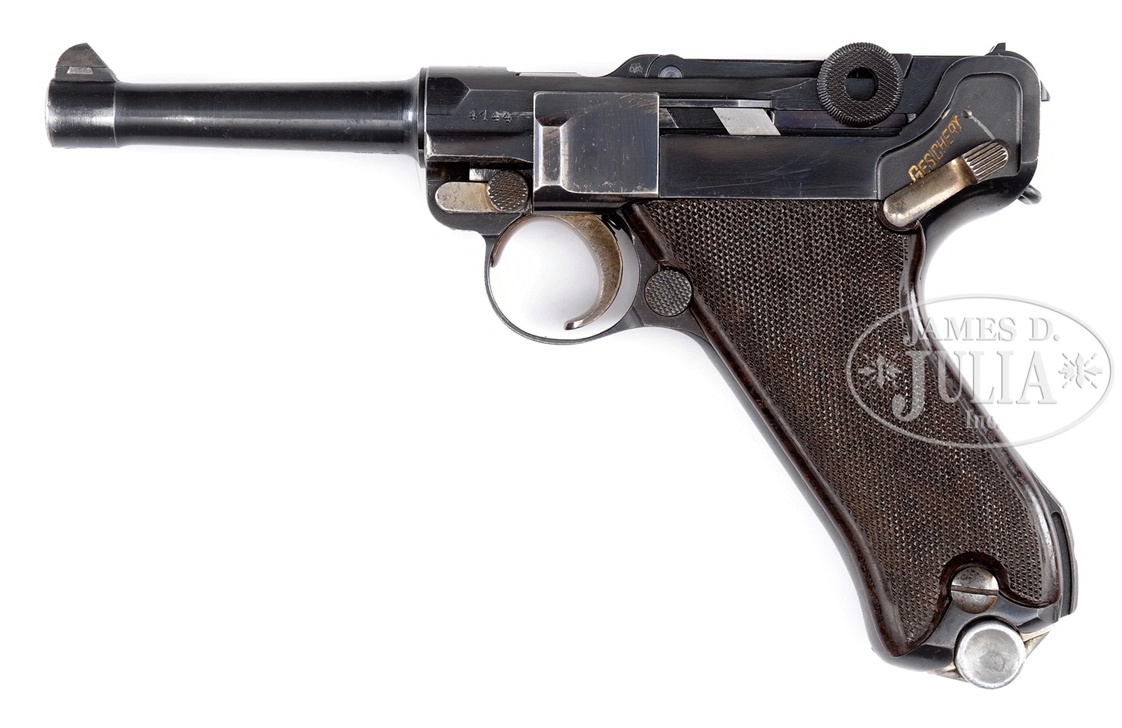 *◊ RARE KRIEGHOFF 36 DATE LUGER WITH MATCHING MAGAZINE.SN 4144. Cal. 9mm. 4″ bbl with Eagle/2 proof and full SN on bottom. “36” above chamber (manufactured in 1936). “HK/KRIEGHOFF/SUHL” anchor logo on center toggle link. Eagle/2 proofs on toggle assembly, right receiver, and right frame rail. Numbered parts on gun are matching. Fine checkered brown plastic grips with border. Orig matching numbered aluminum bottom mag with Eagle/2 proof on bottom. PROVENANCE: The Friedrich-Wilhelm Dauphin Collection, Germany. CONDITION: Very fine, retaining 95% orig blue and 65% orig straw. Scattered spotting and corrosion overall. Most wear is on sideplate. Right mag release lever retains 50% orig fire blue. There is a ding in the bottom of the front grip strap. Grips are sharp with light wear. Bore has light wear and frosting. Mechanics are fine. Mag is excellent. 49829-61 BWS (4,000-7,000) C&R – Lot 1451