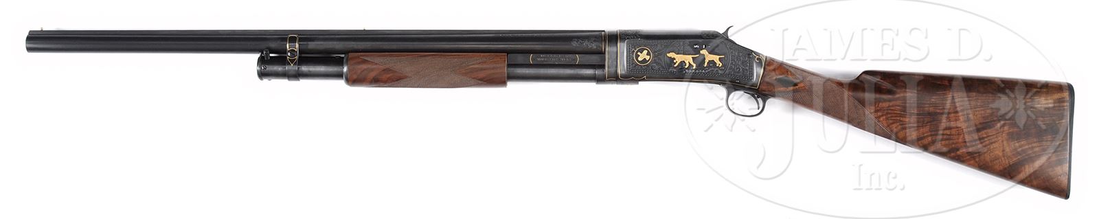 *CUSTOM GOLD INLAID WINCHESTER MODEL 1897 12GA 2BBL SET.SN 339776. Cal. 12 Ga. 26″ bbl. 2-3/4″ chamber. Choked: CYL with extra 30″ bbl Choked: Full. Solid matted ribs with brass mid and front bead. Flame grained American walnut buttstock checkered in 2 point pattern with diamond ebony insert and 13-1/4″ LOP over Winchester Repeating Arms Co HRBP. Forearm is checkered in 3 point pattern. Receiver and breech end of barrels are nicely scroll engraved and receiver is gold inlaid with two pointers and quail on left, setter and 2 quail on right. Gold line borders surround receiver and barrel hardware. Gold inlaid bust of dog’s head on bottom of frame and gold inlaid quail on end of mag tubes. Light scroll engraving on trigger guard. Weight: 7 lbs 15 oz. CONDITION: Extremely fine as custom finished. Retains most of its orig blued finish to all metal parts. Buttstock and forearm are very nice and retain most of their custom finish. Bores are very good with light orange peel. Mechanics are good. 49513-1 JSL (3,000-5,000) – Lot 1452 Click here to view provenance