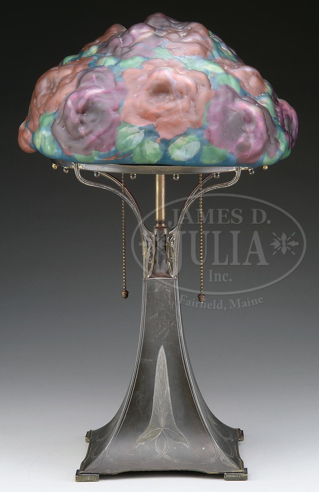PAIRPOINT PUFFY ROSE BOUQUET TABLE LAMP.Pairpoint table lamp has puffy closed top shade with deep red and pink roses against shaded deep green leaf background. Signed on side of fitter with remnants of signature “The Pairpoint Corp’n”. Shade rests on Pairpoint base with tapering square stem with incised stylized leaves on each side, stem gives way to four-arms supporting shade ring around center riser with two-socket cluster. Each socket complete with acorn pulls. Base has rich pewter color with some remnants of brass finish in protected areas. Signed on underside “Pairpoint MFG Co.” along with Pairpoint logo and “3052”. SIZE: Shade is 13″ dia with 10″ fitter. Lamp is 21″ t. CONDITION: Shade has some minor roughness to fitter as well as some grinding to side of fitter rim from factory, otherwise very good to excellent. Base is very good. Re-wired with plastic cord. 50501-162 (8,000-12,000) – Lot 1453
