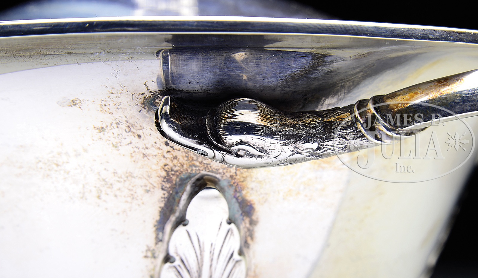 TIFFANY & COMPANY STERLING SILVER COVERED BOWL.Tiffany & Co. sterling silver bowl rests atop four feet with acanthus leaf decoration where they attach to the bowl and hoof bottoms. The bowl also has two applied sterling silver handles with duck heads at each end and is finished with a sterling silver lid with artichoke handle. Marked on the underside “Italy Sterling Tiffany & Co. N.Y.”. Total weight is 682 grams. SIZE: 7″ dia x 6″ t. CONDITION: One tiny dent to side of bowl, otherwise very good. 5-68527 (900-1,100) – Lot 1454