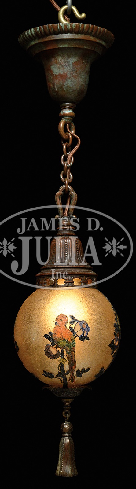 HANDEL JUNGLE BIRD HALL LAMP.Handel hall lamp has small globe shade decorated on the exterior with an enameled brightly colored parrot on front and back with stylized floral vertical bands separating the parrots all set against a gold iridescent chipped ice background. Shade is suspended from a bronze tone fixture with cast decorated metal shade holder and chain with stamped bronzed ceiling cap. Globe is finished with a cast metal tassel in brown patina. Fixture and shade are unsigned. SIZE: Shade 6″ dia. 28″ from ceiling to bottom of tassel. CONDITION: Very good to excellent. One set screw that holds the shade in place is missing. Set screw that secures the ceiling cap in place is missing. 43784-21 (1,700-2,200) – Lot 1454
