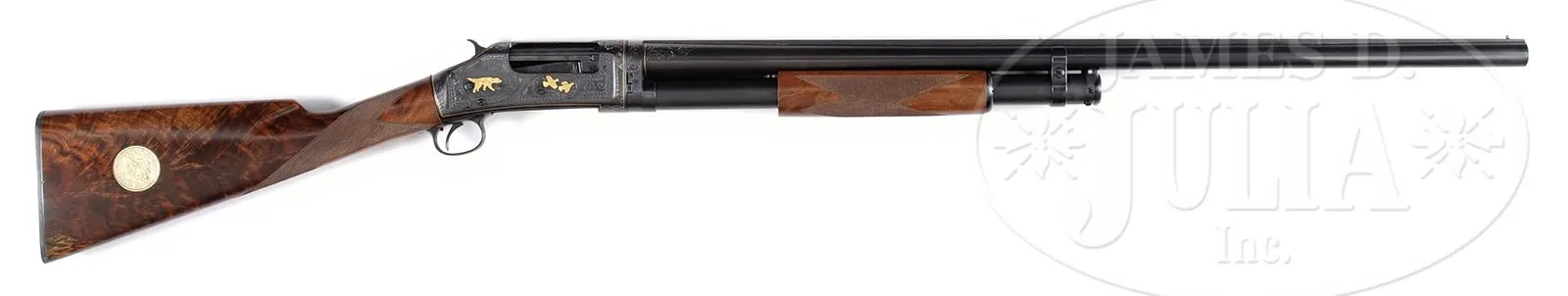 *CUSTOM GOLD INLAID WINCHESTER 1897.SN 272588. 12 ga. 29-1/4″ bbl CHOKED: full. Full length matted rib with brass mid and front bead. Bbl with gold band and light scroll at breach. Straight grip stock is beautiful, flame grained American walnut with 13″ LOP over reproduction Winchester Repeating Arms Co. checkered buttplate, and checkered in 3-pt pattern. Buttstock contains 2 1897 Morgan Silver Dollars, one on each side. Forearm checkered in 3-pt pattern. Receiver is nicely engraved and gold inlaid. Two pointers and quail on left in gold surrounded by scroll and gold border. Setter and two quail on right in gold surrounded by scroll and gold border. Gold quail behind hammer. CONDITION: Extremely fine as custom finished. Retaining nearly all of its new finish to both wood and metal. Mechanics are very good. Bore is bright and shiny. 49513-2 JSL239 C&R (3,000-5,000) – Lot 1454 Click here to view provenance