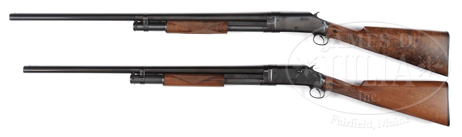 *SCARCE CONSECUTIVELY NUMBERED PAIR OF WINCHESTER MODEL 1897 S.SN 456809/456810. 1) 12 ga. 27-1/2″ bbl. CHOKED: Imp.cyl. Top of bbl is full length matted with brass front bead. Buttstock is checkered in 2-pt pattern with diamond ebony insert on both right and left side near frame. 14″ LOP over Winchester Repeating Arms Co. monogrammed and checkered butt. Forearm checkered and triangular 2-pt pattern on sides. Slide with model marking on left side. Receiver is blued and unengraved. WEIGHT: 7 lbs. 9 oz. 2) 12 ga. 29-1/4″ bbl. CHOKED: Full. Top of bbl is fully matted with brass front bead. Trap gun. Buttstock is checkered in 2-pt pattern with diamond ebony insert on both right and left side near frame. 14″ LOP over Winchester Repeating Arms Co. monogrammed and checkered butt. Forearm checkered in 3-pt pattern. Slide with model marking on left side. Receiver is blued and unengraved. WEIGHT: 7 lbs. 14 oz. CONDITION: Both guns are excellent as refurbished, retaining 97-99% restored finish to both wood and metal. No. 1 gun with grain separation on left hand side of forearm. Checkering is excellent as re-cut. Buttstock was sanded and is slightly below receiver. Bore is fair with scattered pitting throughout. Mechanics are good. No.2 gun with new buttstock and forearm. Bore is good with scattered light pitting. Mechanics are very good. 49513-5 JSL303 C&R (2,000-3,000) – Lot 1455 Click here to view provenance