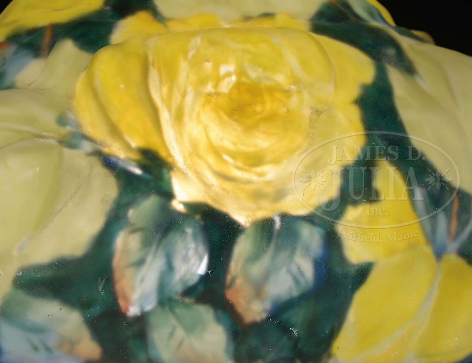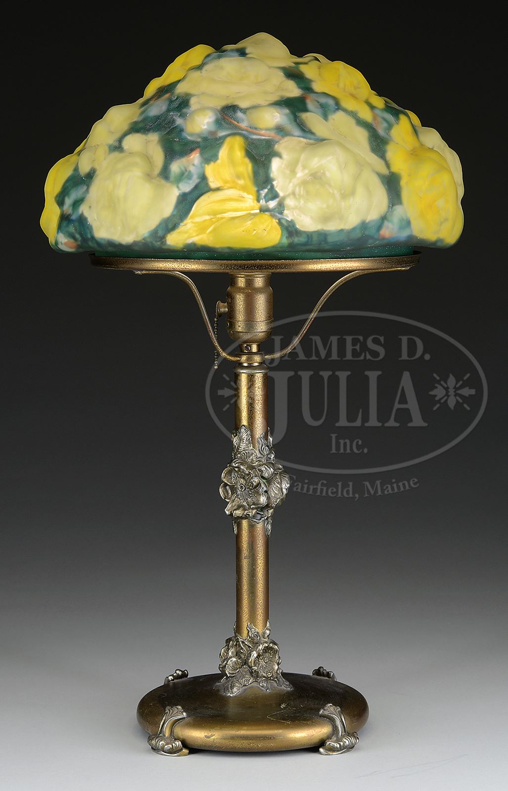 PAIRPOINT PUFFY YELLOW ROSE BOUQUET TABLE LAMP.Pairpoint table lamp has puffy rose bouquet shade with yellow roses against shaded green leaf design background with scattered red highlights to leaves. Unsigned. Shade rests on an original Pairpoint base with brass finish decorated with 4 applied silvered stylized leaf design feet leading to brass finish stem with cast rose design bands at foot and center with silvered finish. Base supports single socket and 3-arm shade ring. Signed on underside “Pairpoint MFG Co.” along with Pairpoint logo “3093”. SIZE: Shade is 13″ dia. with 10″ fitter. Lamp is 22″ t. CONDITION: Shade has some oxidation to paint on interior as well as some spotty oxidation to glass on exterior, otherwise very good. Base is very good to excellent with some minor wear and discoloration to finish. Wired with old plastic cord which is starting to crack. 50201-1 (7,000-9,000) – Lot 1455