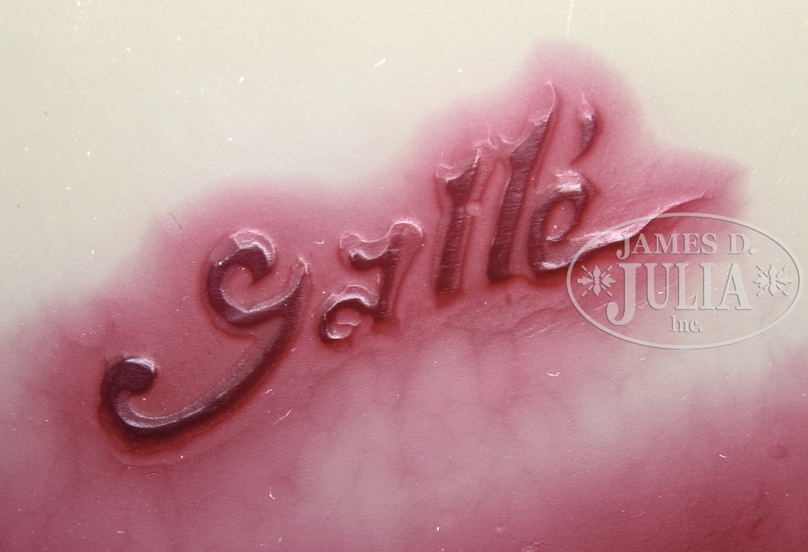 GALLE MOLD BLOWN VASE.Galle mold blown vase has red & pink fuchsia flowers descending from the neck against a shaded cream & yellow frosted background. The vase has a slightly opalescent interior to the mouth and is signed on the side in cameo “Galle”. SIZE: 11-3/4″ t. CONDITION: Very good to excellent with some minor scuff marks to interior of mouth. 1101-13 (9,000-12,000) – Lot 1459