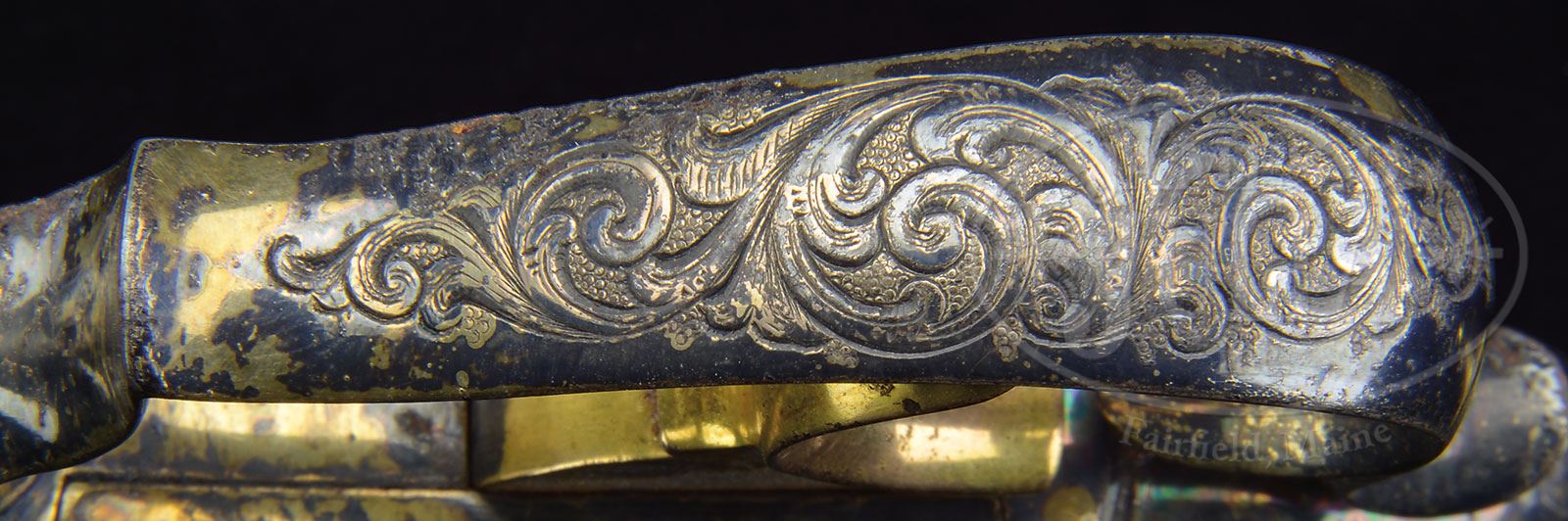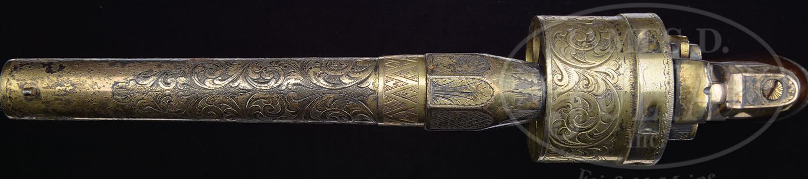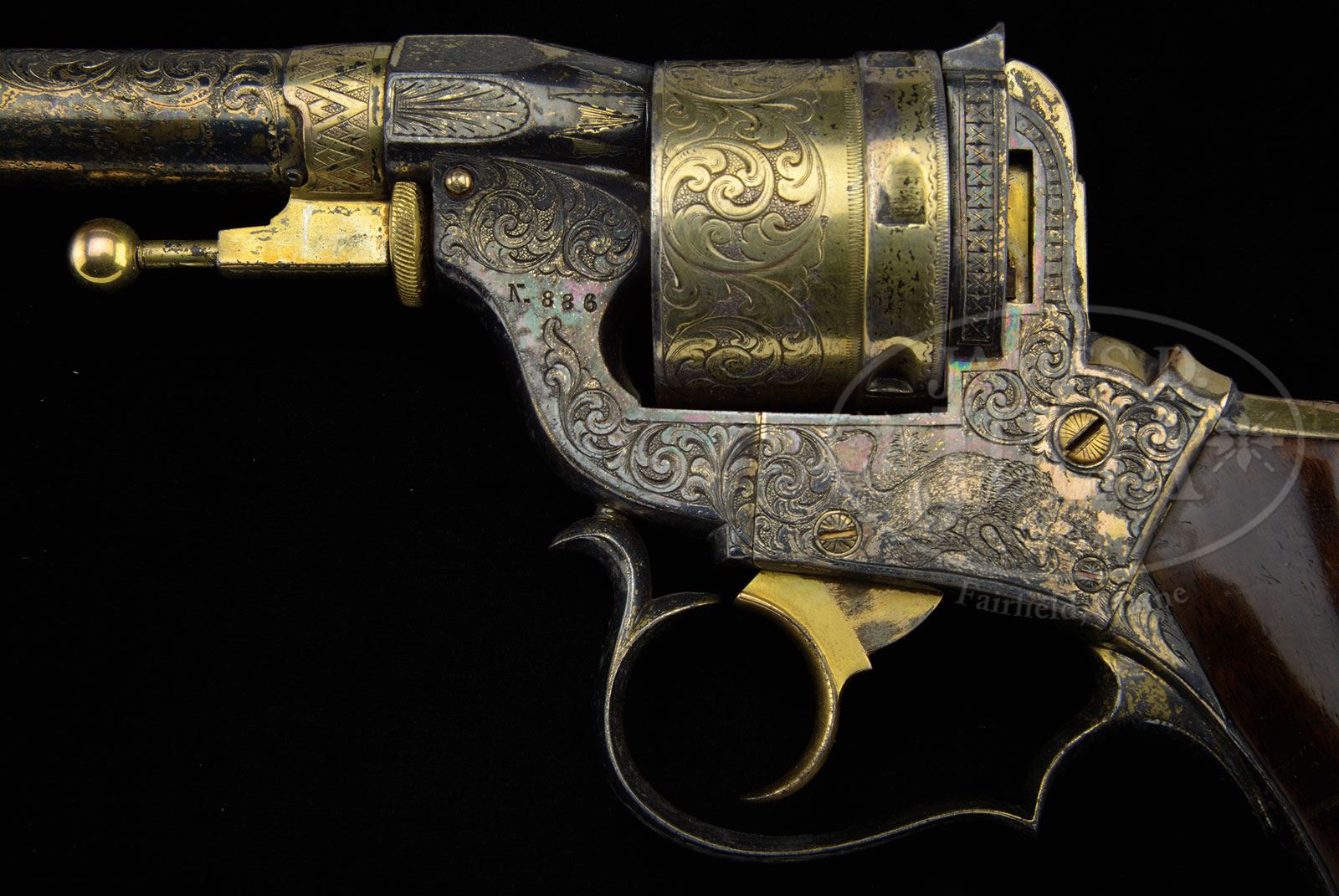 RARE SILVER-PLATED AND GOLD WASHED ENGRAVED PERRIN REVOLVER.SN 886. Cal. 445. This very unusual double action revolver with integral bbl, solid open top frame, with top hinged loading gate, utilized a very advanced 12mm centrally fired cartridge, patented in 1859. 1000 of these revolvers were purchased by the U.S. government on Dec. 16, 1861, but only 550 were received. Many remained in storage and may not have been issued. This particular revolver is unusual in that it is silver-plated and gold washed, and engraved at 80% coverage with New York style large foliate scroll with stippled background, reminiscent of the work of Louis D. Nimschke. It is also unusual in that the left side of frame is engraved with lion attacking a large snake, and right side with what appears to be a Tasmanian tiger. Left side of frame and bottom of bbl are marked with SN. Right side is marked with “Perrin & Cie Bte” and with a burst with a star in center over “PARIS”. Grips are of smooth burl walnut. Domed grip cap has lanyard ring. Consignor states that this gun, according to family history, was a gift to his great great grandfather on his grandmother’s side and has descended in the family since that time. Accompanying the gun is a family photo of this gun taken many years earlier. CONDITION: Excellent, retaining 90% of its silver-plate which has considerably tarnished, and has some areas of rusting through, mostly on right side of action below cylinder and on right side of bbl. Trigger, hammer, cylinder, and takedown pin are gold-plated and retain a considerable amount of that plating. Grip retains nearly all of its French polish finish. Action is crisp. 4-46986 (7,000-10,000) – Lot 1461 Click here to view provenance