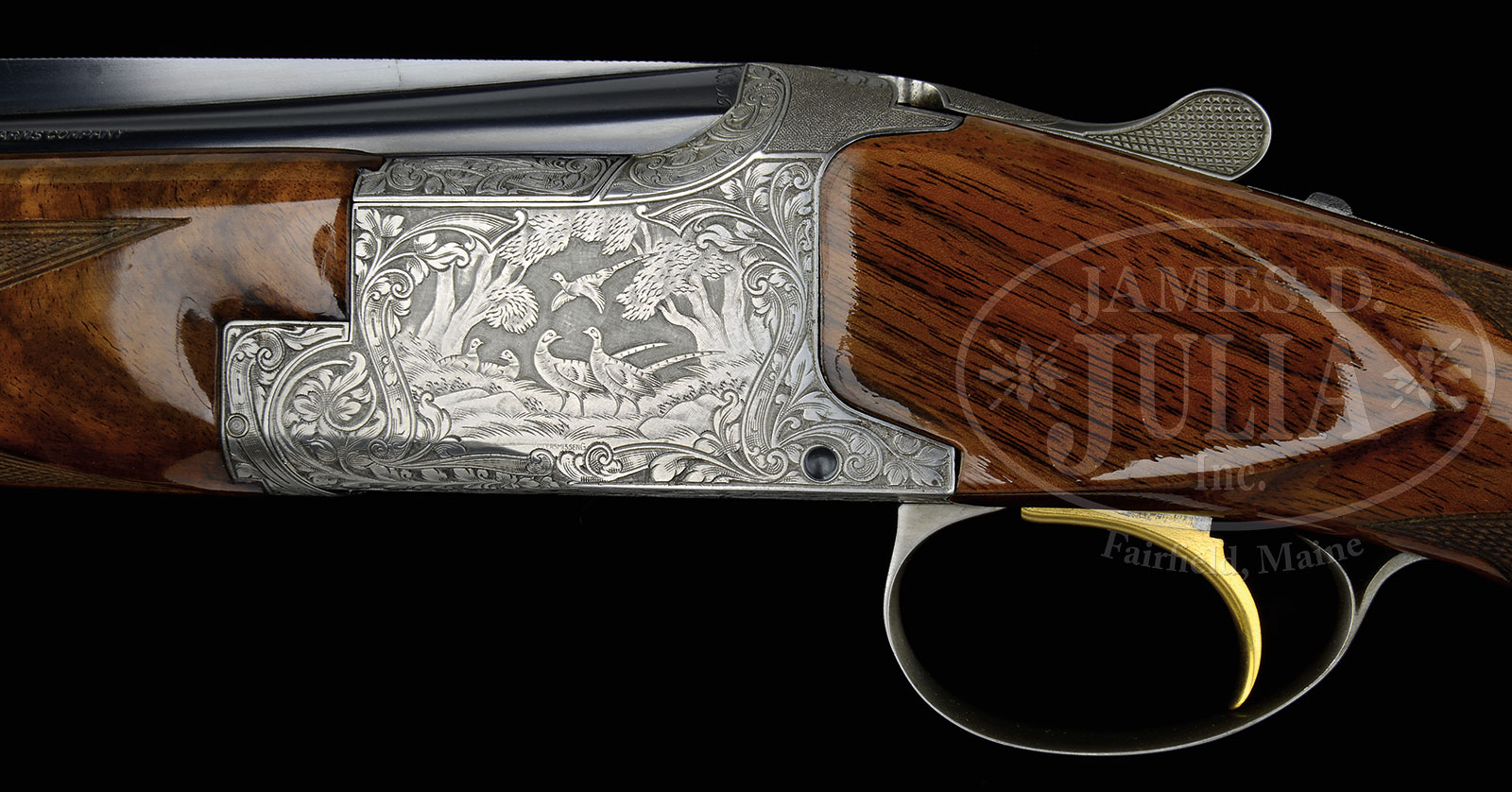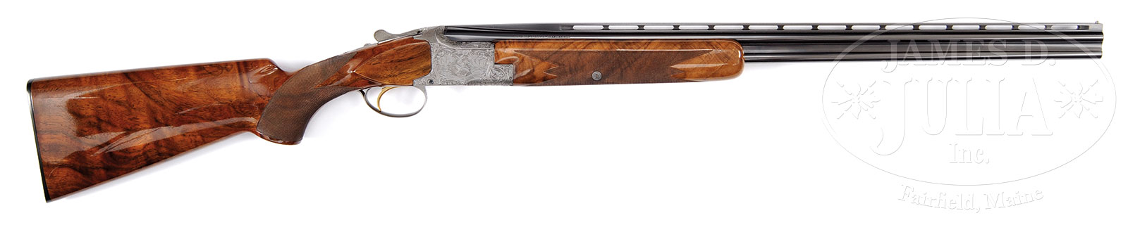 *RARE BROWNING SUPERPOSED DIANA GRADE 410 SHOTGUN ENGRAVED BY VANDERMISSENG WITH CASE.SN 185657. Cal. 410 ga. 26-1/2″ bbls. 3″ chambers. Chokes marked Mod/Full. Full length matted ventilated low profile top rib with steel front bead. Gold plated sst, auto ejectors, non-auto safety. Stock is FKST config, checkered in two-point pattern with 14″ LOP over Browning HRBP. Round nosed forearm checkered in five-point pattern. Receiver is beautifully engraved in typical Diana pattern with pheasants in woods scene on left, ducks in marsh scene on right, quail on bottom, all surrounded by tasteful foliate scroll engraving. Trigger guard with two rabbits in woods scene. Top of action is neatly stippled. Housed in an orig Browning brown leather case with woolen interior. Weight: 6 lbs. 12 oz. CONDITION: Excellent, as partially restored. Bbls retain 97% orig blued finish. Buttstock and forearm are factory original however refinished by Browning due to period hazing. Previous owner shipped gun to Browning for factory refinish. Receiver with coin finish is excellent with only very minor staining noted. Bores are excellent. Mechanics are crisp. Case is very good with some light rub marks and minor fraying. A gently used and well cared for .410 superposed. 51681-2 JSL (6,000-10,000) – Lot 1461