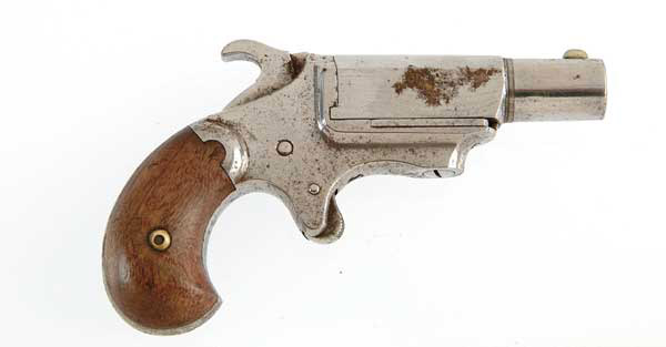 ETHAN ALLEN HALF OCTAGON. DERINGER. SN 934. Cal. .41, 2-1/2″ half oct. bbl. Standard 2-line markings on top of the bbl. CONDITION: Metal has been polished with light pitting and heavy rust remaining. Grips have been cleaned and are fair to good. 4-45926 FS445 (500-800)