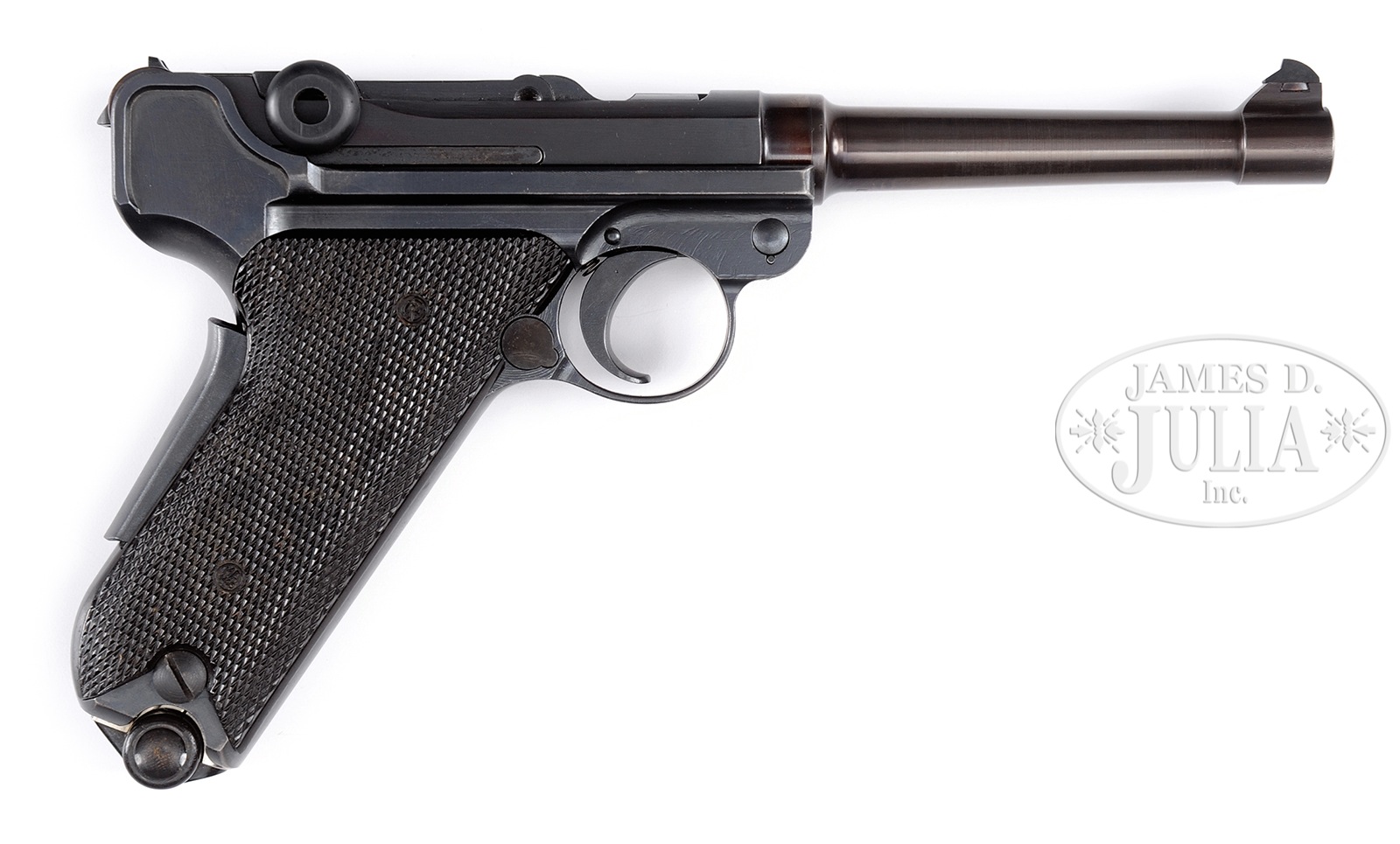 *◊ WAFFENFABRIK BERN 1929 SWISS LUGER WITH 9MM BARREL.SN 76920. Cal. 9mm. 4-3/4″ bbl with Swiss proof above “12” on bottom. Bbl appears to be contemporary with blue that does not match rest of the gun. Swiss Cross in shield on center toggle link. “W+F” logos on back of frame and next to full SN on left frame. Numbered parts are matching. “P” release mark on front of frame. “6.45” stamped in front frame well (indicates manufacture in June of 1945). “9” on stop lug underneath chamber. Brown plastic “W+F” marked checkered grips. Grip safety. Proper brown plastic bottom Swiss mag with “P” on the spine. PROVENANCE: The Friedrich-Wilhelm Dauphin Collection, Germany. CONDITION: Excellent, retaining 98% orig blue on frame, receiver, and toggle assembly. Blue on bbl appears to be contemporary. Grips are bright and sharp. Bore is bright and sharp. Mechanics are excellent. Mag has very little wear. 49829-138 BWS (1,000-2,000) C&R – Lot 1462
