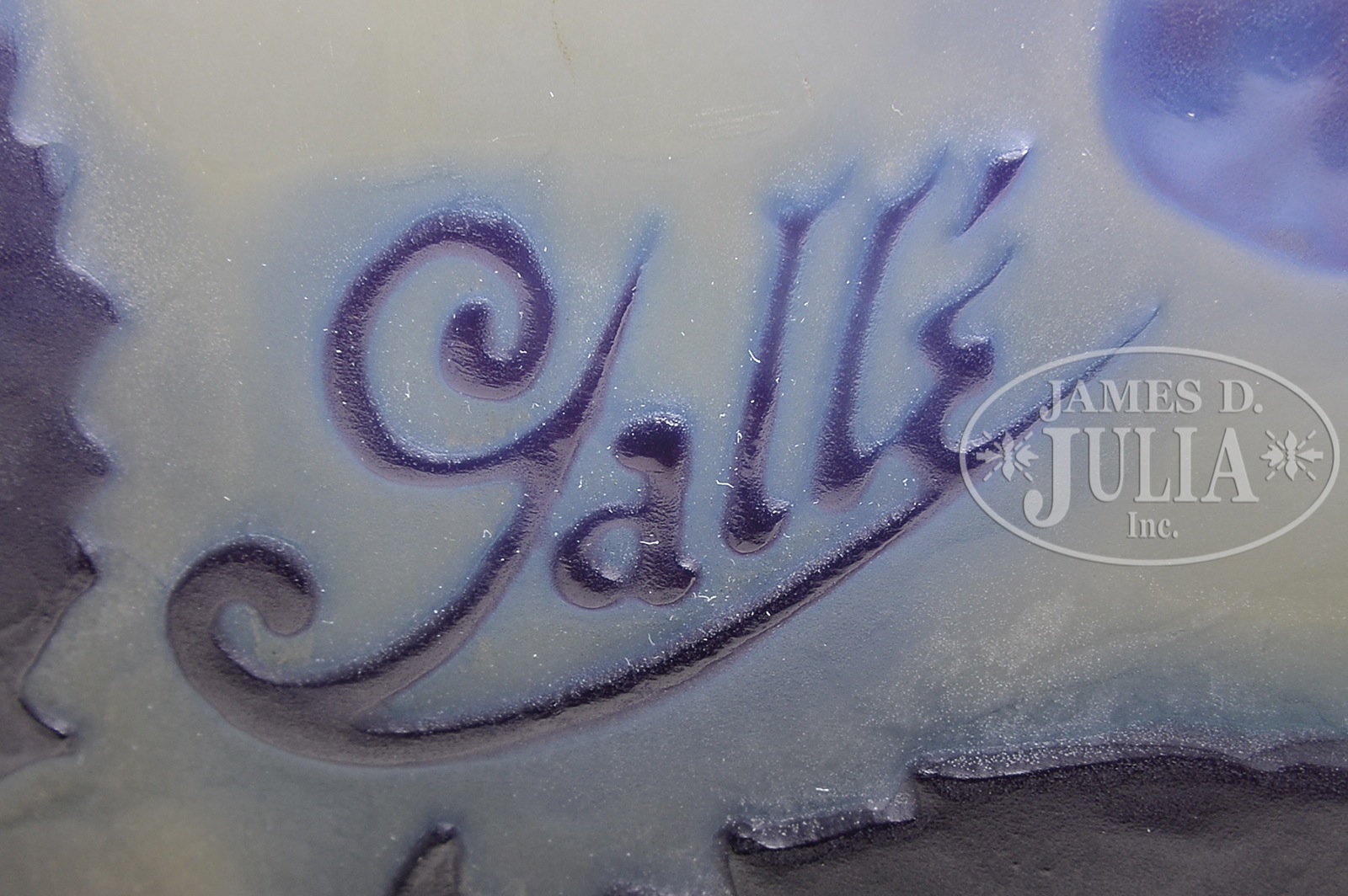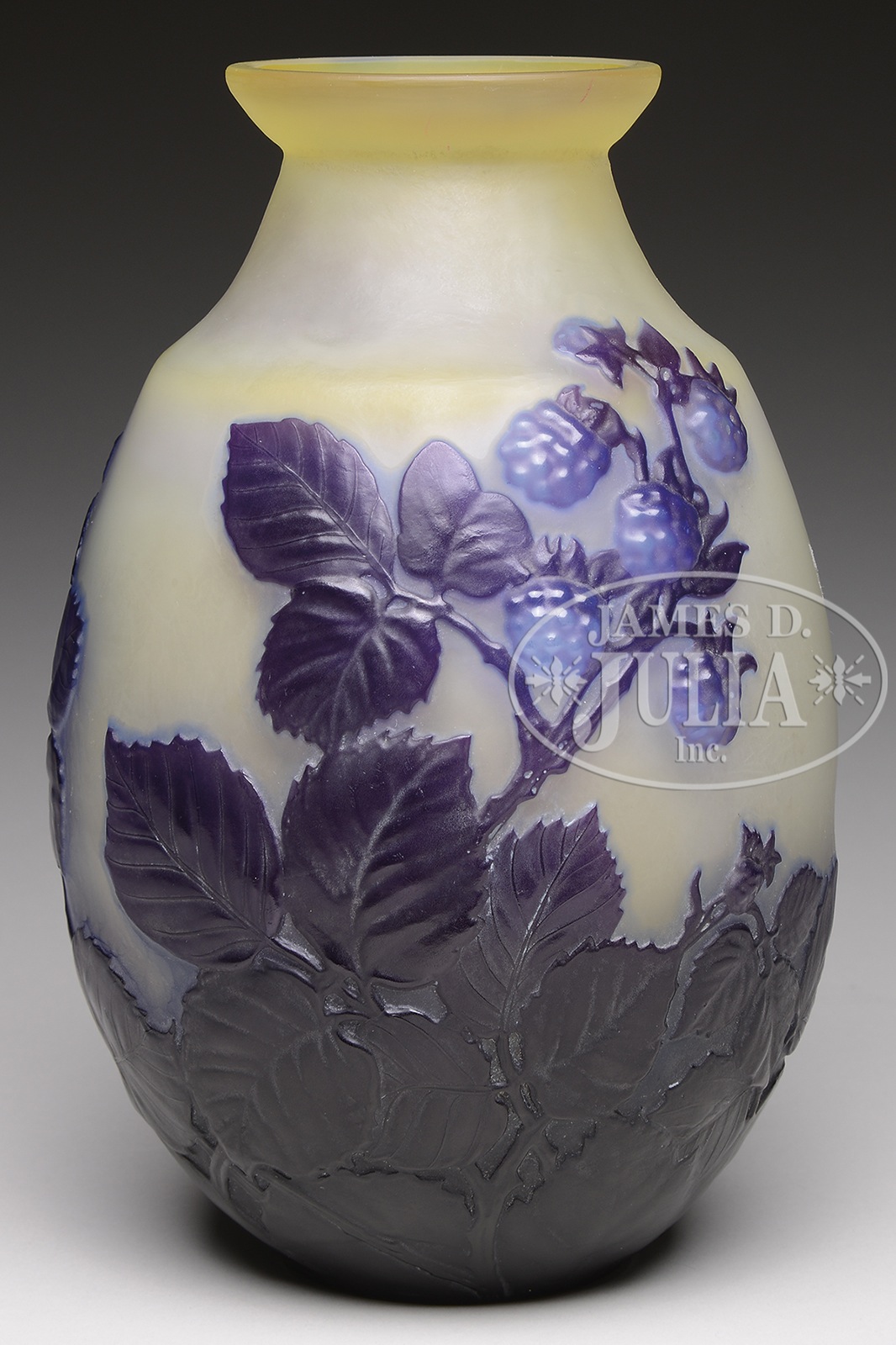 GALLE MOLD BLOWN VASE.Galle mold blown vase, has large purple leaves and thorny branches with light blue and purple berries surrounding the vase all set against a pastel, frosted yellow background. Signed on the side in cameo “Galle”. SIZE: 9-1/4″ t. CONDITION: Very good to excellent. 47375-33 (4,000-6,000) – Lot 1463