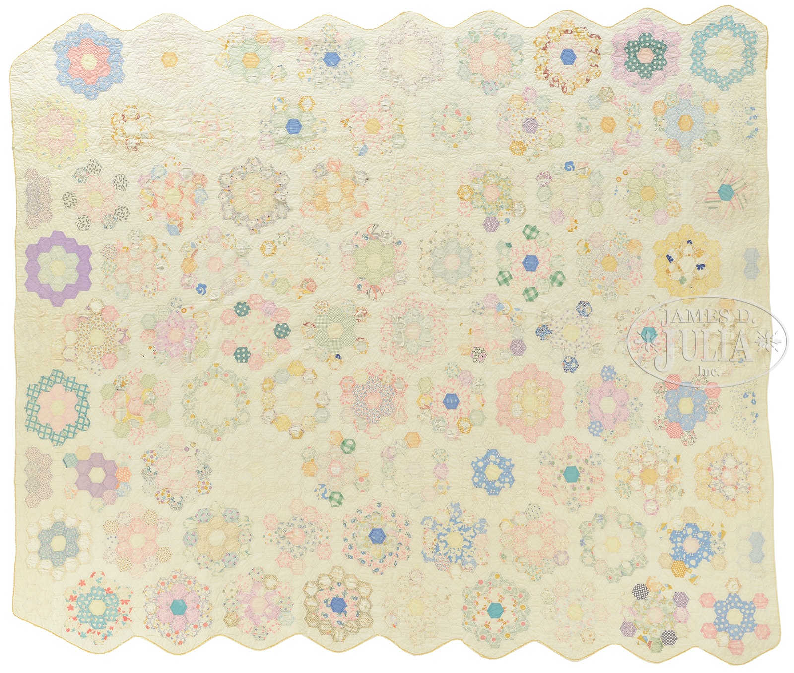 FOUR 19th CENTURY PATTERN QUILTS.1) Block style pattern with white squares inside dark squares. 15 x 15 5″ squares having an 8″ border on four sides. The back in brown; 2) Flower type quilt having a center 9-row hexagon linked to six 5-row hexagons, all with a green background. Back being a brown print; 3) Flower type quilt with alternating rows of five flowers in seven rows. Green border, black backing material; 4) Mother’s flower garden type quilt, nine rows of nine flowers, all with different print in solid colors. SIZE: 1) 88″ x 93″; 2) 76″ x 77″; 3) 69″ x 75″; 4) 86″ x 72″. CONDITION: 1) Several squares have popped and have losses, fair to good; 2) some fading, some losses to small hexagon blocks, fair to good; 3) Breaks in some material both front and back, used; 4) Faded, breaks, well used. 9-25040 (300-500) – Lot 1464