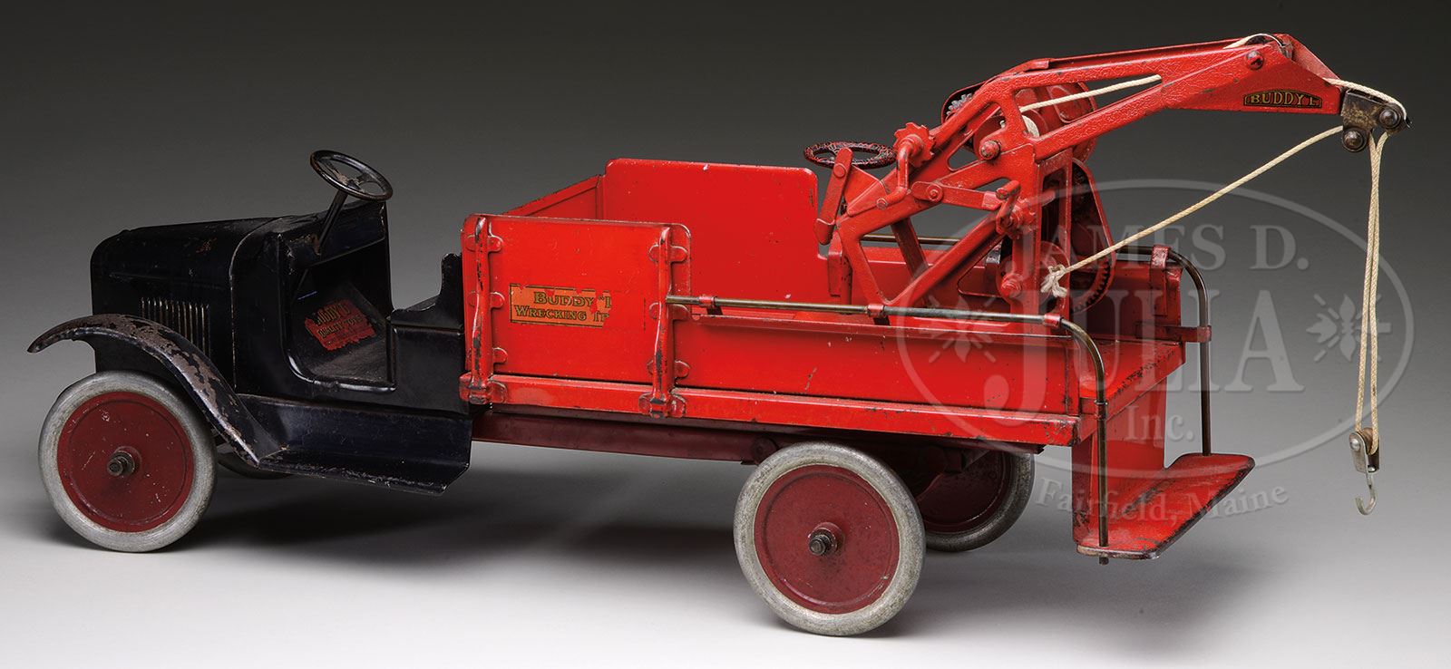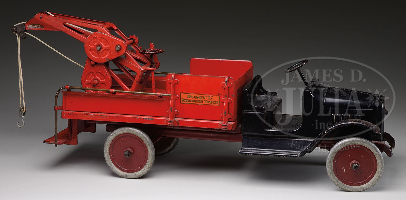 Scarcer pressed steel model shows open cab truck with complex towing boom mechanism. Boom raises and lowers, rotates on turret and retrieves towing hook. Black cab with red body and chassis, solid brass handrails, cast aluminum wheels and steerable front end. SIZE: 27″ l, 32″ w/boom extended. CONDITION: Black painted area is fair to good with top of fenders showing most wear. Red bed area has good paint with all functions working. 1-14899 (1,000-1,500) – Lot 1466