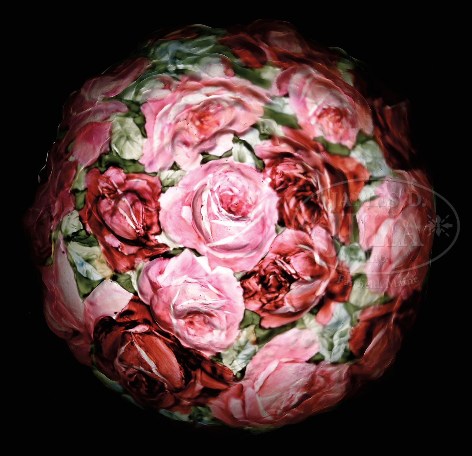 PAIRPOINT PUFFY ROSE BOUQUET TABLE LAMP.Pairpoint table lamp has puffy rose bouquet shade with pink and red roses against shaded green leaf background. Signed on exterior fitter “Pat. Applied For”. Shade rests on an original Pairpoint base with round platform supported by four stylized leaf feet. Cylindrical stem is decorated with two rows of cast flowers, stem leads to two socket cluster and shade ring. Base has remnants of brass finish and is signed on underside “Pairpoint MFG Co.” along with Pairpoint logo and “3093”. SIZE: Shade is 13-1/2″ dia with 10″ fitter. Lamp is 19″ t. CONDITION: Shade is very good to excellent. Base is very good with wear to finish. Re-wired with contemporary plastic cord. 50449-6 (8,000-10,000) – Lot 1466