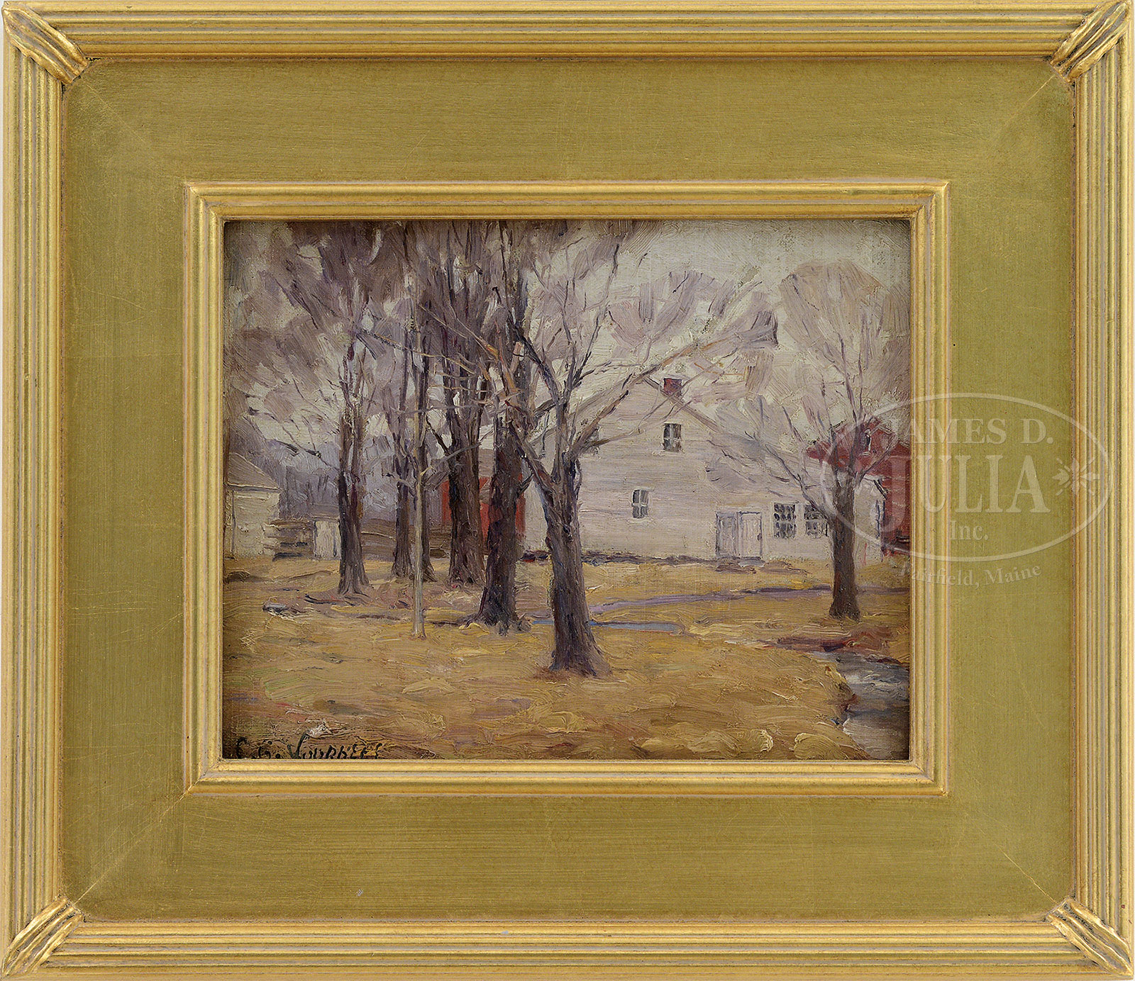 CLARK GREENWOOD VOORHEES (American, 1871-1933) THE WHITE SALT BOX.Oil on board Housed in a fine carved and gilt modern frame with gilt liner Signed lower left “C G Voorhees” SIZE: 8″ x 10″. Overall: 13-1/2″ x 15-1/2″ CONDITION: Very good 52188-12 (800-1,200) – Lot 1468