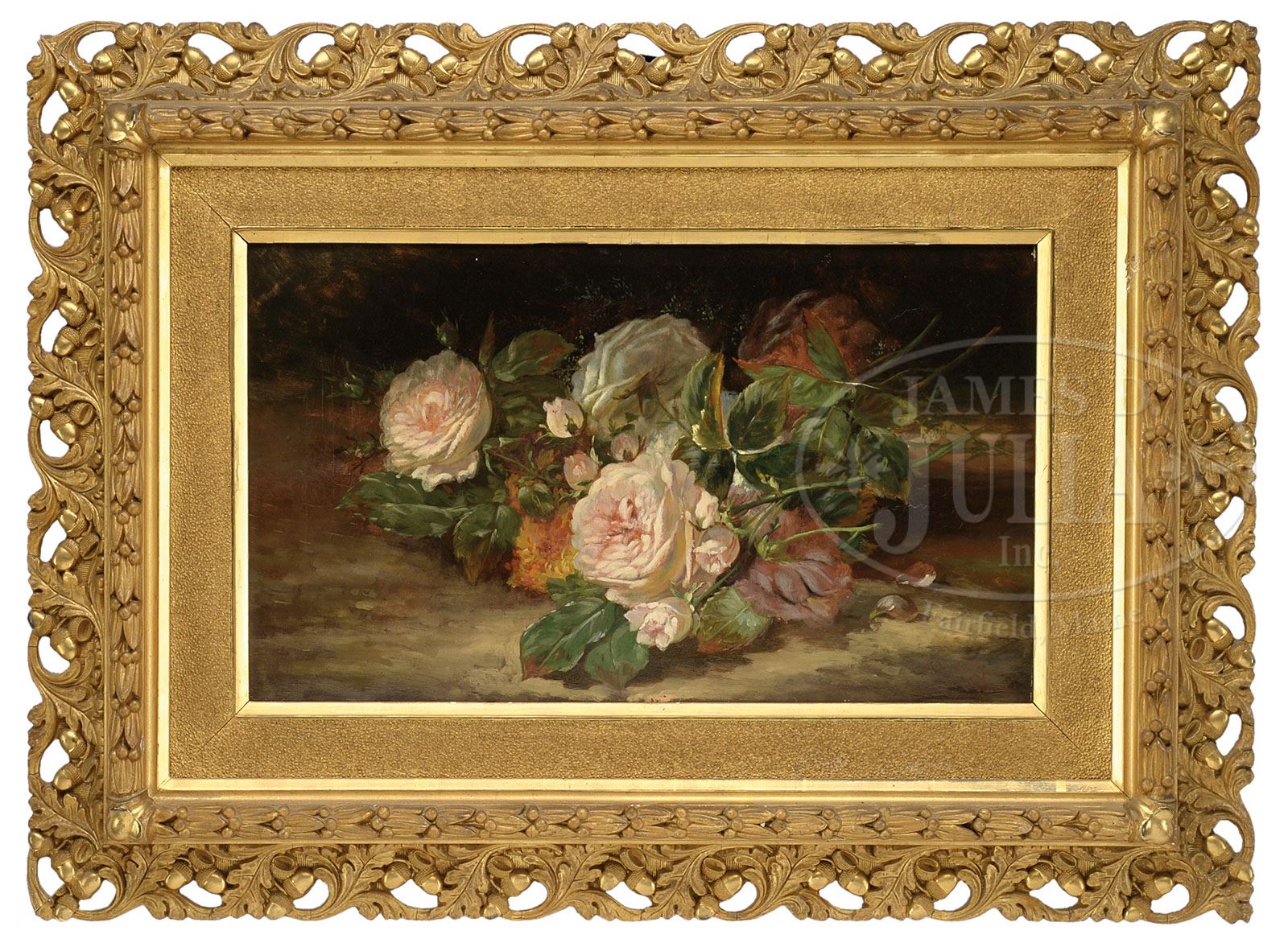 C T WILSON (American, 19th Century) STILL LIFE WITH ROSES. Oil on canvas Housed in its original acorn decorated gilt frame with gilt sand finished liner Canvas stamp “Henry Leidel, New York” on verso Signed lower right “C T Wilson N.Y. 87″ SIZE: 12″ x 20″. Overall: 22-1/2″ x 30-1/2”. CONDITION: Craquelure, very good 9-90968 (1,500-3,000)