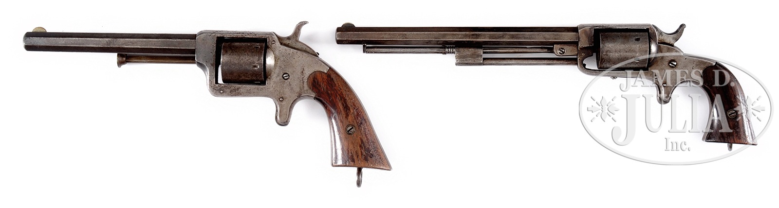 SCARCE COLLECTOR’S LOT OF JAMES REID MODEL NO. 2 & MODEL NO. 4 PISTOLS.SN 2598/2652. 1) .31/.32 cal dual ignition revolver for rim-fire and percussion. Six-shot rd cylinder, rare 8″ octagon bbl., spur trigger, 2-pc walnut grips. The butt with aftermarket lanyard ring. This revolver has a spring loaded shell extractor under the bbl. This is a rare and hard to find revolver. 2) Model-2 low hump revolver .32 cal. 5-1/2″ octagon bbl. Extractor on right side of frame. 6-shot cylinder. Spur trigger. 2-pc walnut grips. Orig lanyard ring in butt. Loading gate on right side of frame. Crowned muzzle. PROVENANCE: The Carmen Gianforte Collection. CONDITION: 1) Very good overall condition. All metal retains a gray patina with traces of orig blue finish. Grips rate very good with small grain separations at butt. Approx 40% varnish remains on grips. Mechanics are excellent and crisp. Bore is very good with minor orange peel. 2) Very good overall. All metal retains a gray patina with traces of orig blue finish. Grips rate very good and fit quite well. Grips retain approx 60-70% orig varnish. Mechanics are very good. Bore is very good with minor orange peel. 49895-15, 49895-16, JSL71 (1,850-2,250) – Lot 1472 Click here to view provenance