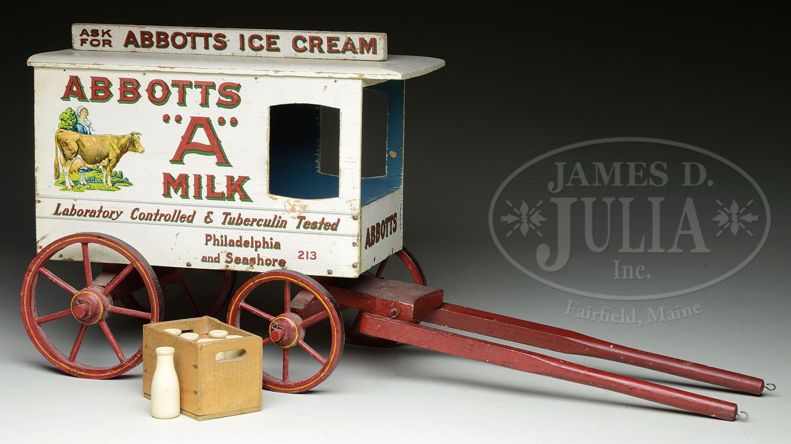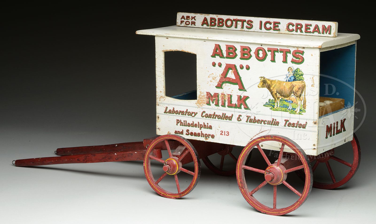 UNUSUAL ABBOTTS MILK WAGON.Similar in nature to the various milk wagons produced by the Schoenhut firm of Philadelphia, PA in the 1920s and early 1930s. This particular example is somewhat smaller than the usual models and of lighter construction as well. Perhaps this could have been produced by the Schoenhut firm to accompany their reduced line of circus animals and figures? Of the various milk wagons produced by the Schoenhut firm, this is probably one of the most visually attractive models featuring a cow and milkmaid, an abundance of lettering on the side and a marquee on top for Abbotts Ice Cream. Included with wagon is a crate of milk containing six bottles. SIZE: Overall is 11-1/4″ not including shafts. CONDITION: Overall very fine plus condition. Some minor flaking to left side, lacking horse. 1-15156 (1,200-1,800) – Lot 1474 Auction: Advertising, Toy & Doll Auction - Fall 2014 Please Note: All prices include the hammer price plus the buyer’s premium, which is paid by the buyer as part of the purchase price. The prices noted here after the auction are considered unofficial and do not become official until after the 46th day. |