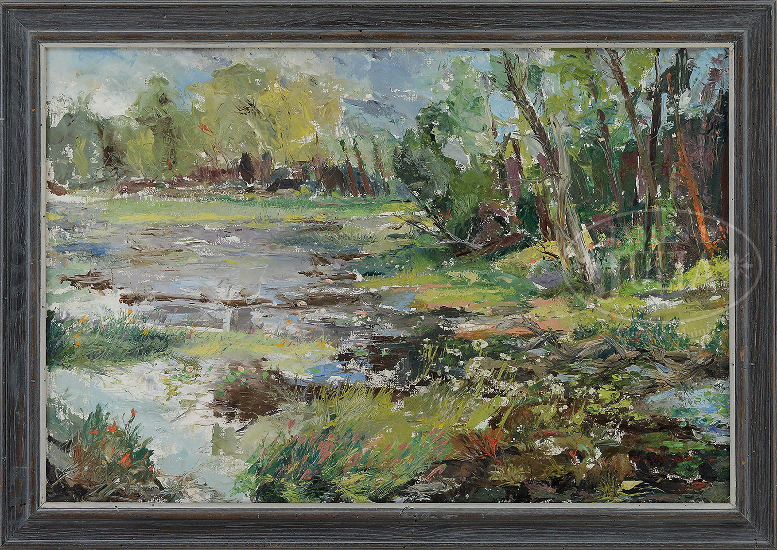 EDWARD HUGO EN _ _? (American, Mid 20th Century) LANDSCAPE WITH COLORFUL FOLIAGE.Oil on canvas Housed in contemporary grey frame Signed and dated lower right illegibly, “Edw. H. Ena..man 50”, bears fragment of a label inscribed “Edward Hugo…” on frame SIZE: 24″ x 36″. Overall: 28-3/4″ x 40-3/4″ CONDITION: Very good 52099-45 (500-700) – Lot 1476